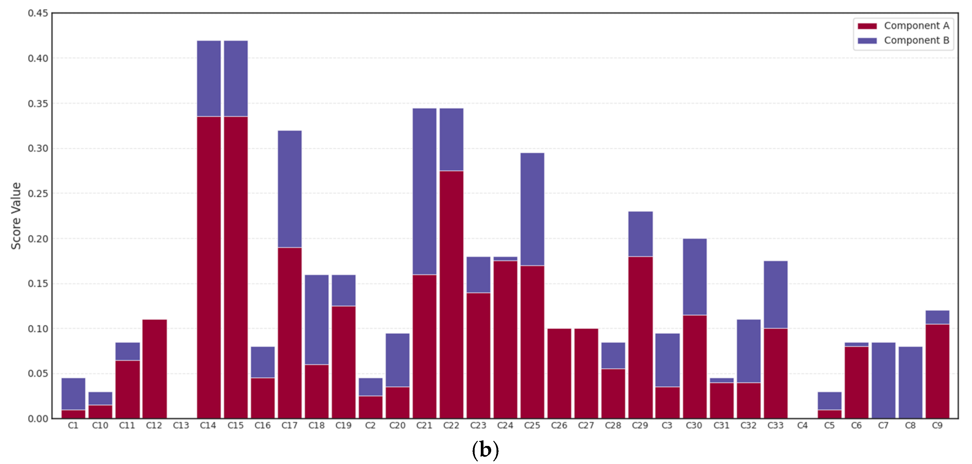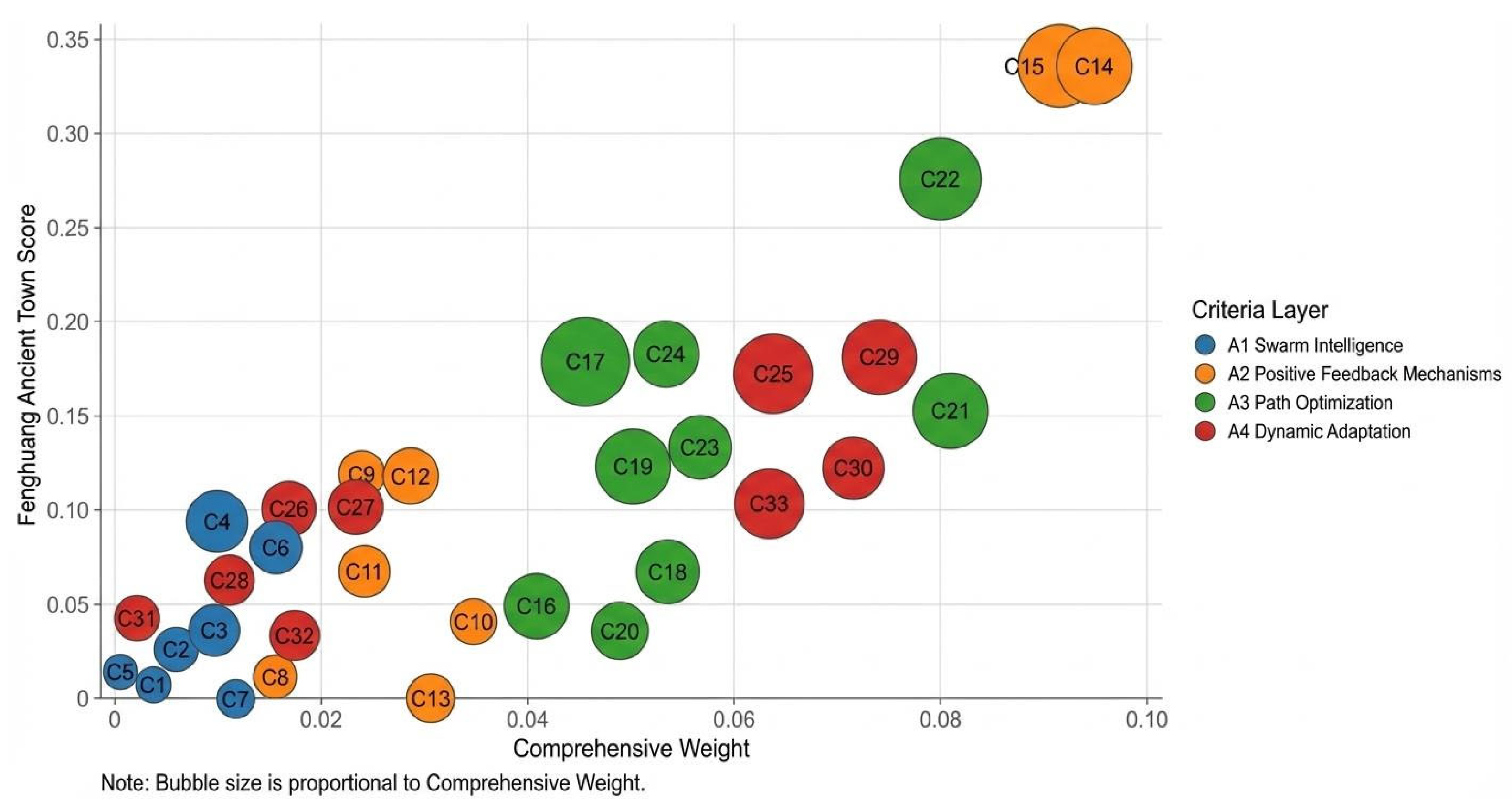 • Comprehensive evaluation results at the criterion level: The scores and contributions of the four bionic dimensions are uneven. The path optimization (A3) dimension has the highest contribution, the positive feedback mechanism (A2) and dynamic adaptation (A4) dimensions have the middle scores, and the group intelligence (A1) dimension has the lowest scores, indicating that the ancient town is weakest in the “human” dimensions, such as community organization, knowledge dissemination, technology application, and intelligent decision-making. These are the key dimensions that lower the overall resilience score. This indicates that the ancient town is weakest in the “human” dimension of community organization, knowledge popularization, technology application, and intelligent decision-making, which is the key dimension that lowers the overall resilience score.