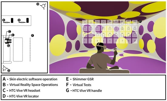 The experimental environment is built according to the standard VR development process. Three-dimensional spatial models are created in Blender (Blender Foundation) and imported into Unity Real-time Rendering Engine (Unity Technologies). The basic dimensions of the virtual space (length 4.0 m × width 2.0 m × height 6.0 m), geometric structure, and lighting conditions were kept constant, with only the color features varying according to the independent variables. To ensure the accuracy of color restoration, the project uses a linear workflow to set the sRGB color space. Table 2 details the specific RGB (0–255) and HSV parameters of color stimulation, which are strictly defined according to the Itten color wheel. The lighting environment is standardized by baking neutral white light (color temperature: 6500K, intensity: 1.0). Participants watched the scene through the HTC Vive Pro headset (dual AMOLED 3.5-inch screen; monocular resolution: 1440 × 1600 pixels; refresh rate: 90 Hz), and the brightness was set to a standardized comfort level. Physiological signals were recorded using the Shimmer3 GSR+ unit (Shimmer, Dublin, Ireland) at a sampling rate of 52 Hz. The experiment took place in a laboratory at Northeastern University, with temperature controlled at approximately 23 °C. The laboratory containing only the VR device, physiological data collection equipment, and seating, with room temperature maintained at a stable and comfortable level to minimize environmental disturbances.