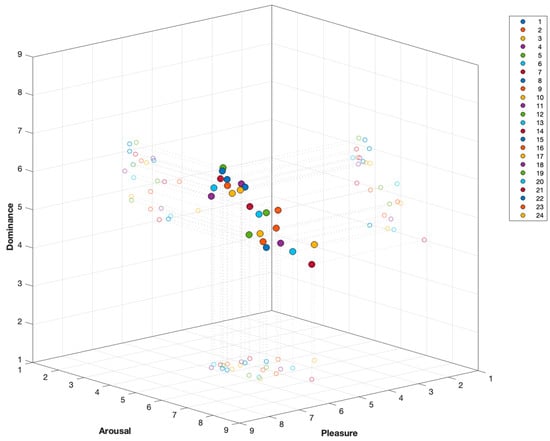 To visualize the overall emotional picture, we calculated and drew the average PAD (pleasure, arousal, dominance) score of each space in 24 experimental spaces (as shown in Figure 3). The results show that different spatial configurations show different emotional characteristics. Space 20 demonstrated a high overall PAD score, with a color scheme consisting of a 50% Area proportion of streamlined forms and a combination of red and orange hues. This spatial composition indicates that the combination of warm-toned analogous colors, moderate area coverage, and smooth contour forms has the most significant effect on stimulating positive emotions, particularly in terms of pleasure and a sense of control. In contrast, Space 14 achieved an intermediate PAD score, characterized by a square geometric form covering 50% of the area, combined with a blue-purple color scheme. This color-form relationship reflects a more neutral perceptual and emotional quality, placing it within the middle range of emotional responses. Space 6 received the lowest PAD score, primarily characterized by a sharp geometric form covering 100% of the area, combined with a red-green contrasting color scheme. This result indicates that the combination of fully covered sharp shapes and strong contrasting colors is most likely to evoke negative emotional experiences, significantly reducing pleasure and a sense of control while maintaining a high arousal level.