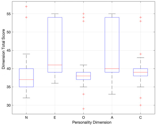 Figure 4 presents a descriptive analysis of the five major personality traits. This box plot indicates that the distribution and median scores for Extraversion (E) and agreeableness (A) are relatively high with a wide interquartile range, suggesting significant variation in performance among participants. Openness (O) exhibits a more balanced distribution, with data clustered around the median and moderately dispersed. In contrast, Neuroticism (N) and conscientiousness (C) show lower median scores and relatively narrower interquartile ranges, indicating more concentrated distributions for these traits. Some outliers are observed in this figure, suggesting individual variability within the survey population.