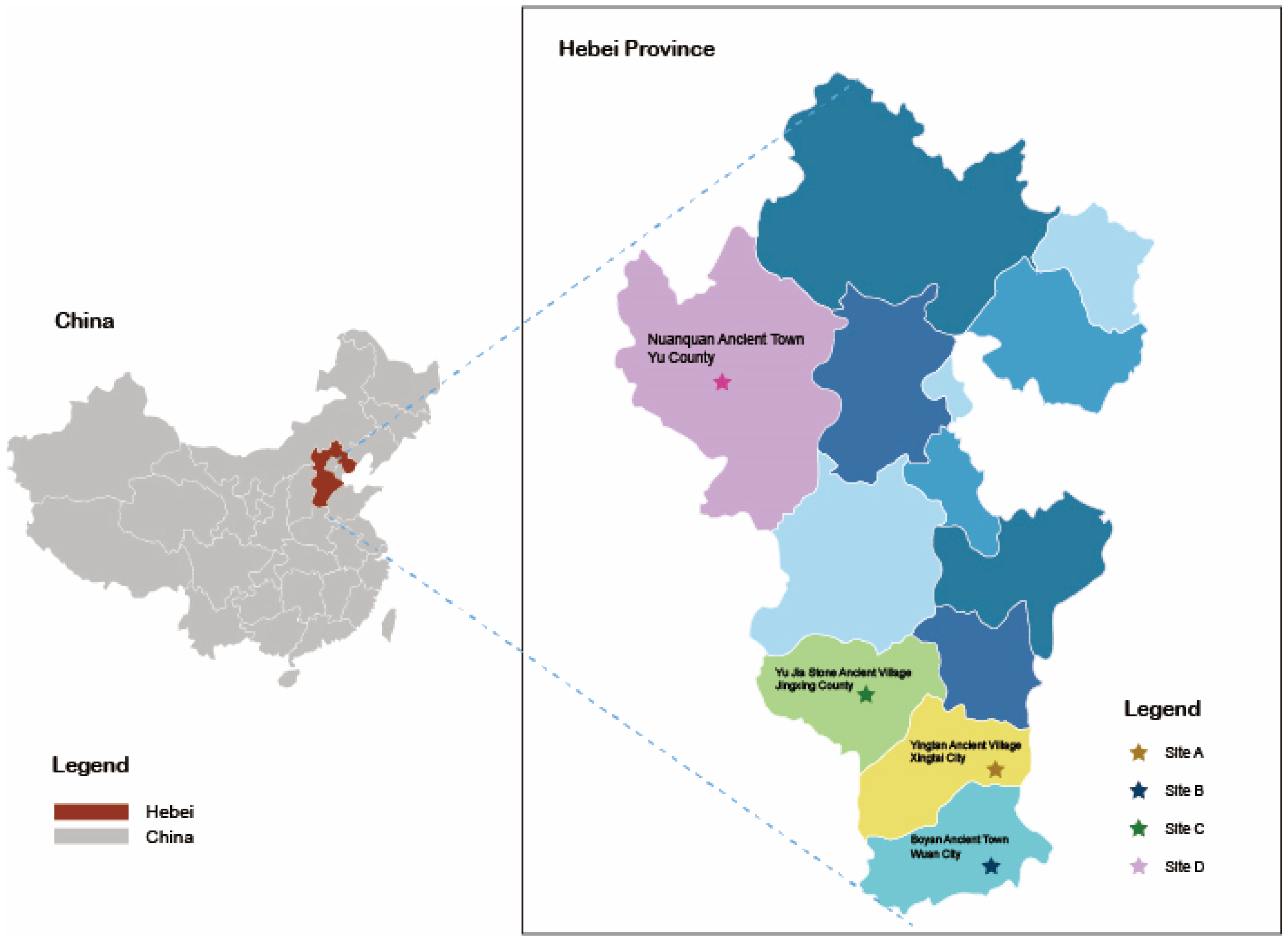 Sample collection points were primarily established at four distinct locations within Hebei Province: Yingtan Ancient Village, Xingtai City; Boyan Ancient Town, Wuan City; Yu Jia Stone Ancient Village, Jingxing County; and Nuanquan Ancient Town, Yu County. (Figure 1). Further comprehensive details regarding the fundamental characteristics of these sites are presented in Table 1. The research period spanned from March 2020 to December 2024.