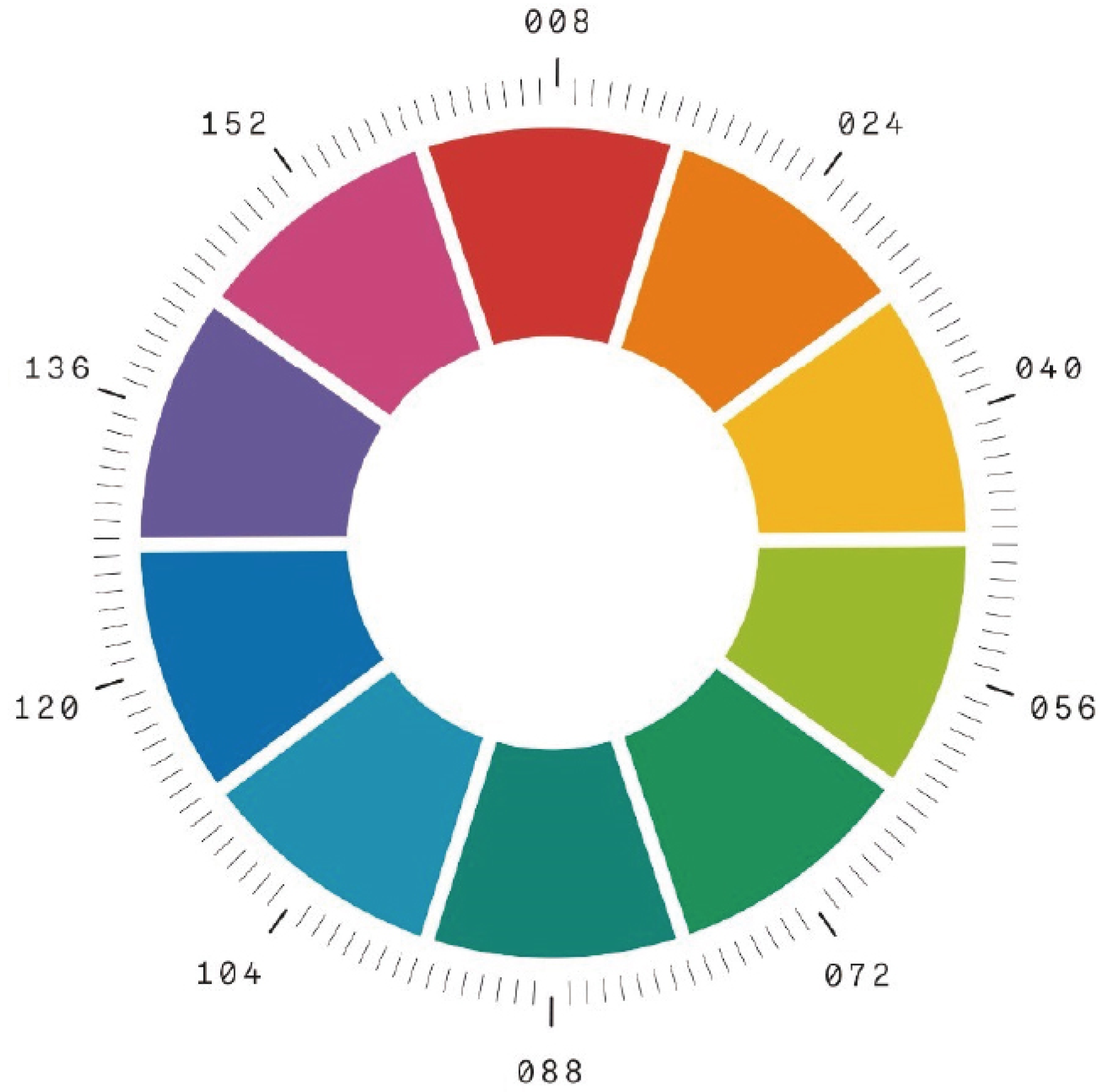 Hue is divided into 160 levels, expressed as numerical values from 0 to 160 (Figure 2). The hues are arranged sequentially on a hue ring in a counterclockwise direction, beginning with red and progressing through yellow, green, blue, and purple, before returning to red. This arrangement provides comprehensive coverage of the visible spectrum.