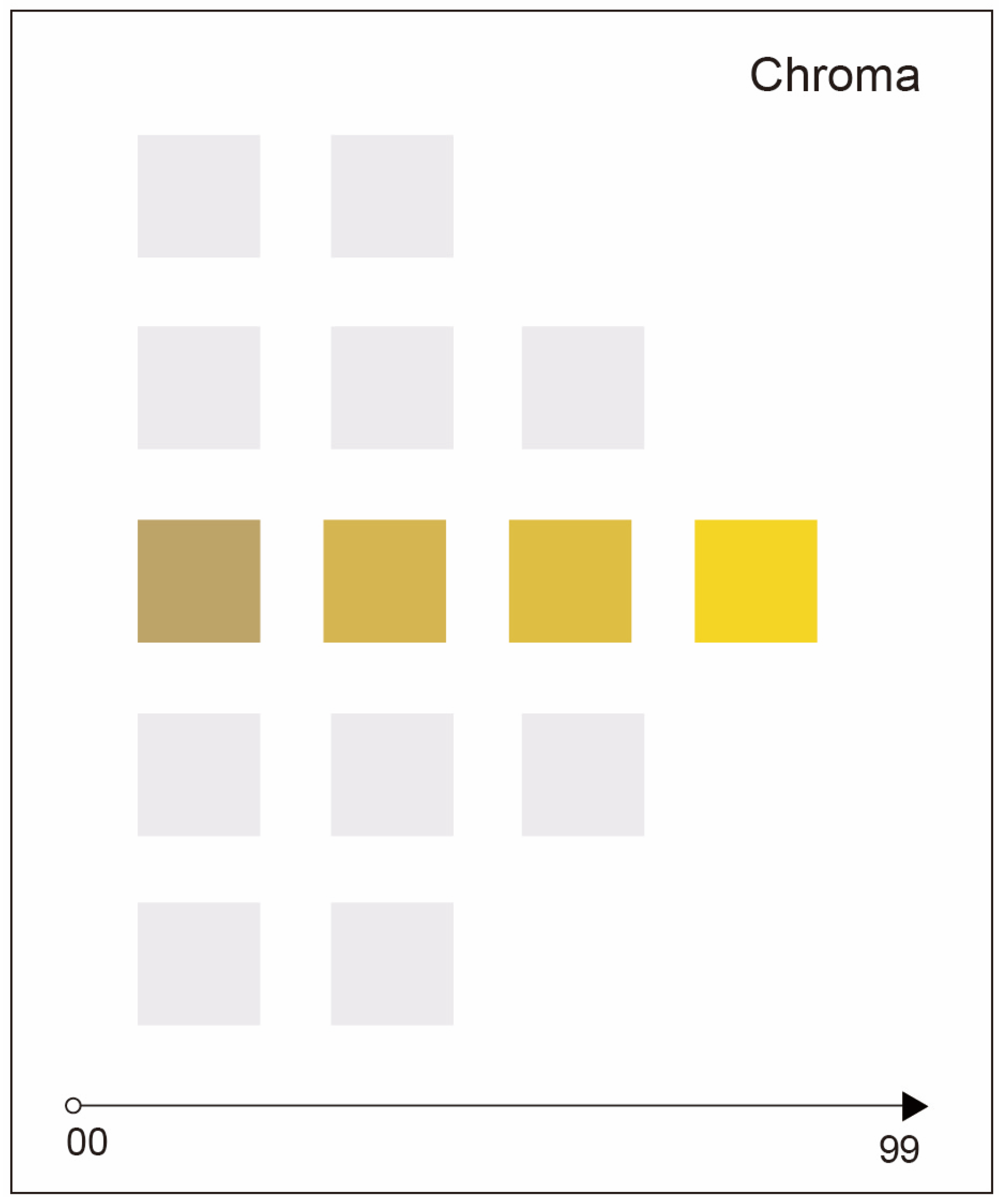 (Figure 4), or colour purity, is represented as open chromaticity. It increases radially from the centre of the hue ring outward, with values arranged sequentially (e.g., 01, 02, 03, …). Very low chromaticity is denoted by 00, while common purity values appear in increments such as 02, 12, 22, and 32. The concept of open chromaticity allows for the potential integration of new colour ranges that may emerge with future technological developments, ensuring the adaptability of the system.