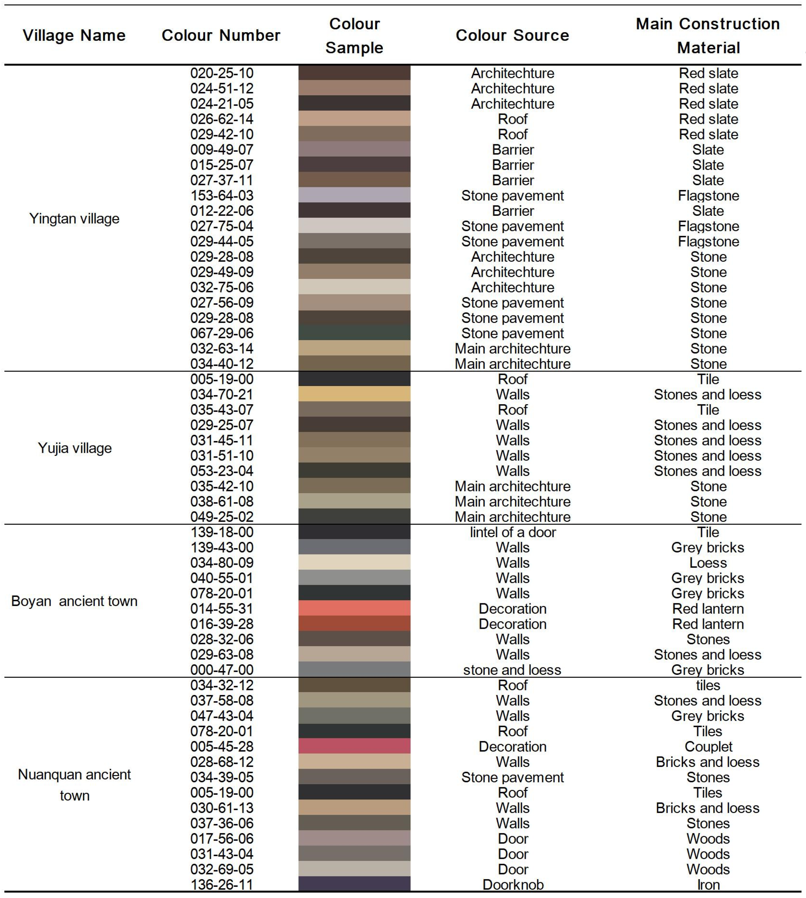 The representative images of four ancient villages—Yingtang Village (Xingtai County), Yujia Village (Jingxing County), Boyan Ancient Town (Handan City), and Nuanquan Town (Yu County)—were selected for colour extraction. The analysis yielded systematic data covering four dimensions: colour numbers, colour samples, colour sources, and primary construction materials.