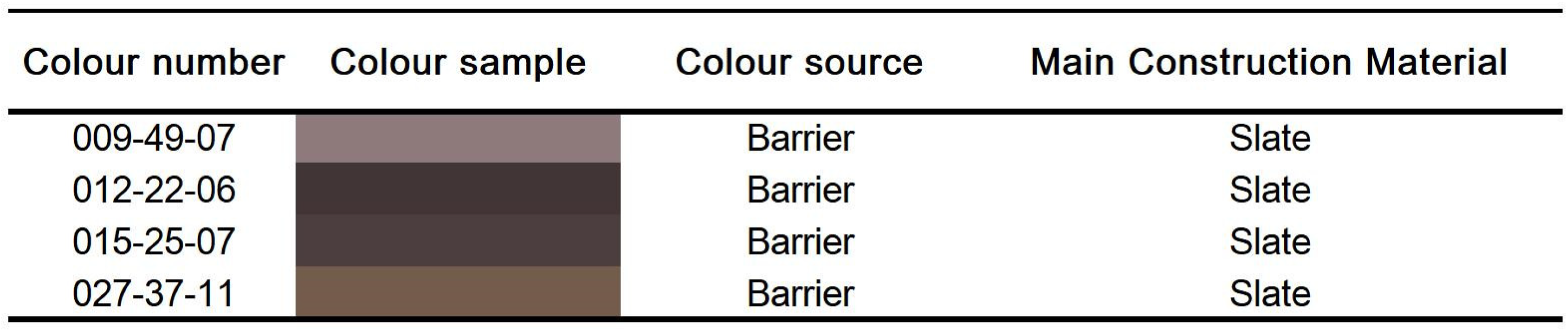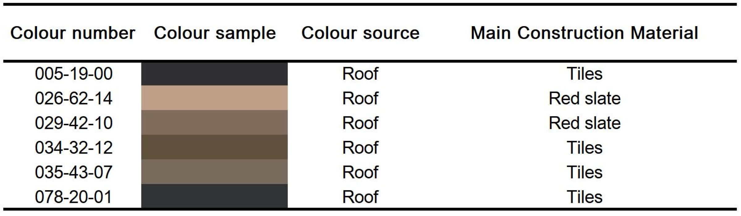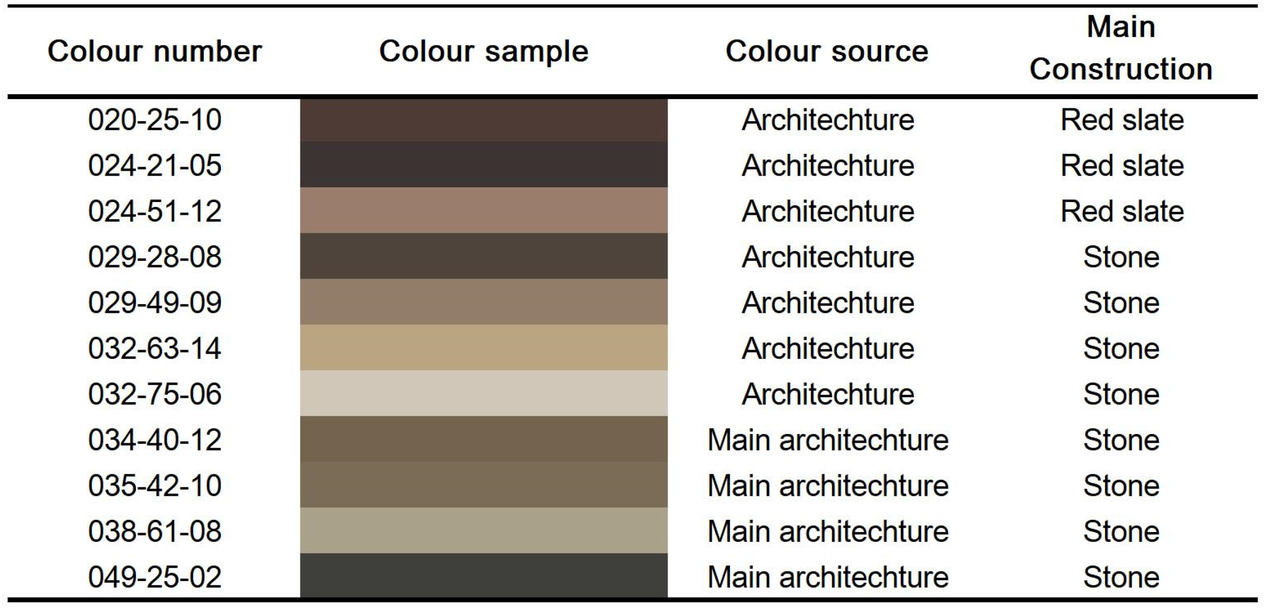 To minimise measurement deviations, multiple cross-checks were conducted between photographic sources and field observations during analysis. Field photography was scheduled between 10:00 and 15:00 on clear days. This ensured consistent natural daylight conditions and reduced colour discrepancies between photographs and artefacts caused by varying natural light. These issues were resolved by comparing digital outputs with on-site colour samples. Consequently, the resulting dataset maintains sufficient accuracy to reveal primary colour patterns and their relationship with building materials such as stone, timber, and brick. This dual-verification approach enhances the robustness of findings and supports the validity of the derived chromatic characteristics. As lighting conditions may influence colour capture in digital imagery, multiple measures were implemented to minimise measurement error and ensure data precision.