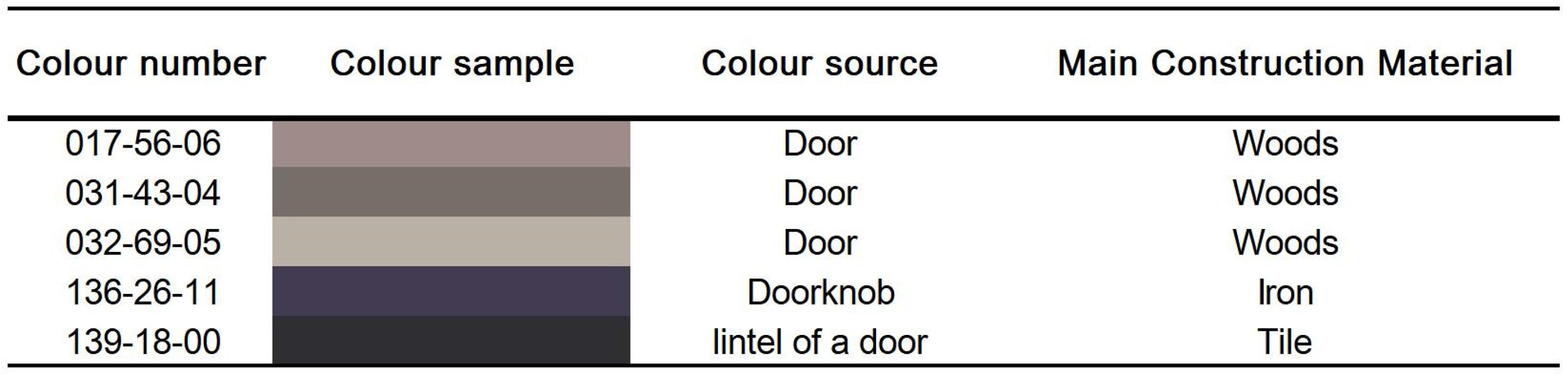 The door colors were extracted (Figure 12). Hues are concentrated in 017–032 (red–orange–yellow), with brightness in 43–69 (medium-high) and chroma in 04–06 (low). Made mainly of light wood, the doors show light beige and light red tones, giving a rustic and elegant effect. The iron handles (hue 136–139, blue-violet) have low brightness (18–26) and low chroma (00–11), appearing as dark iron grey.