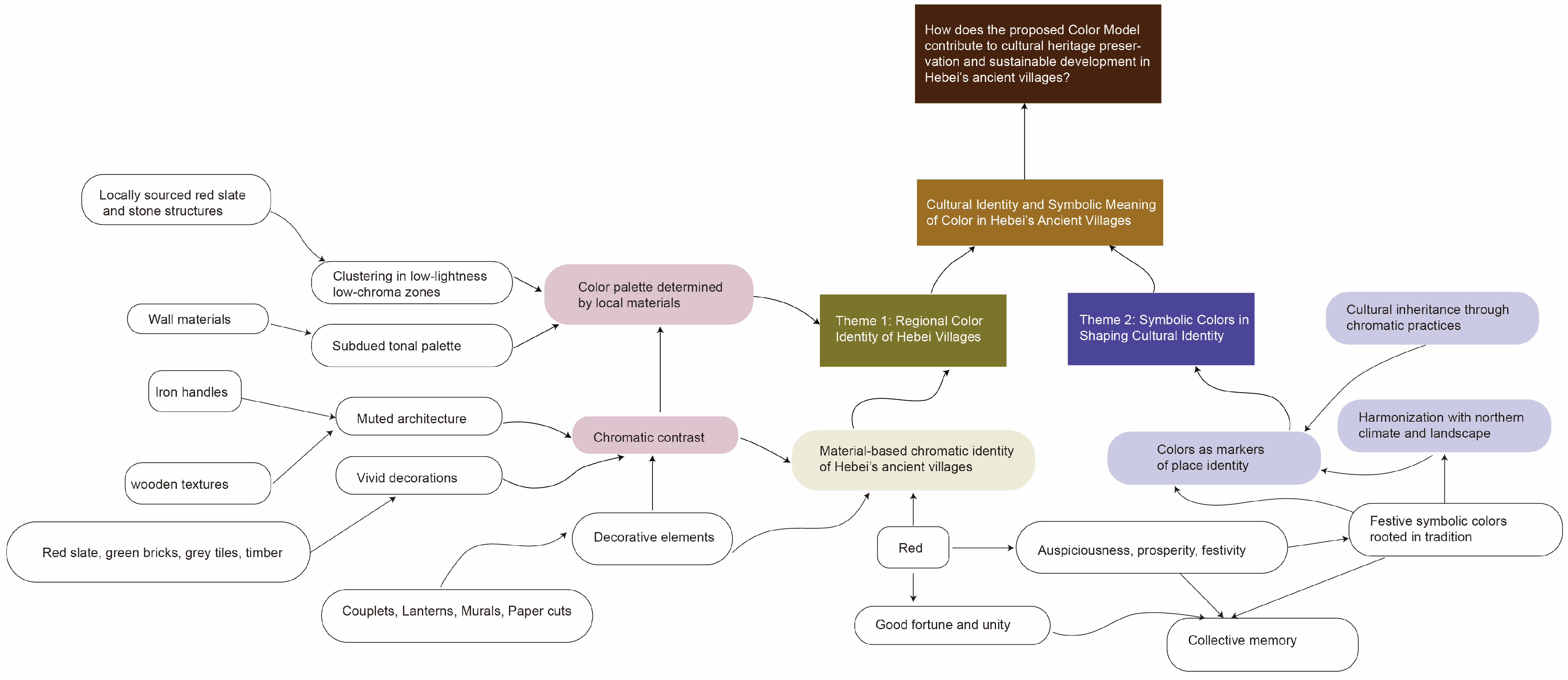 Data analysis employs thematic analysis, using ATLAS.ti 24 software to systematically code interview records and images of ancient villages, extracting key themes and categories related to the color characteristics of Hebei’s ancient villages. These are then integrated with relevant theoretical frameworks, particularly local identity, color semiotics, and architectural color aesthetics, to construct a color model that enhances regional identity in Hebei. This provides a theoretical foundation for cultural heritage protection and sustainable development.