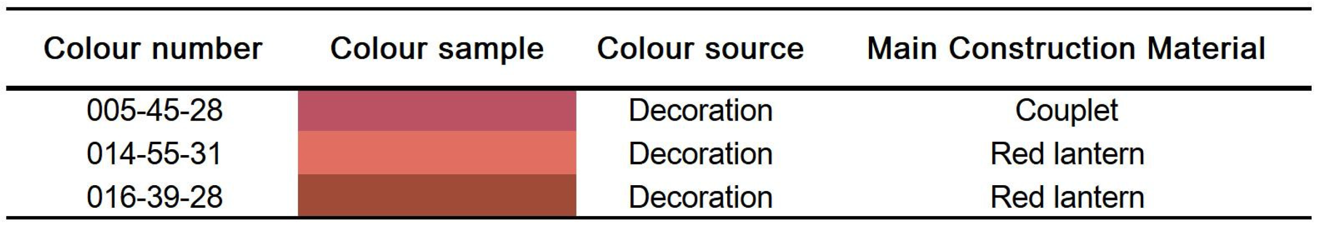 Colour values were extracted from the decorative elements of ancient buildings. In the photographs of the ancient villages, the main decorations—red couplets and red lanterns—display distinctive Chinese cultural features. The hue values are concentrated around region 05–016, between red and red-orange; brightness values fall within 39–45, representing a medium brightness level; and chroma values are concentrated in 28–31, corresponding to high colour saturation. These colour characteristics originate from the materials used, primarily red rice paper and red cloth, which naturally produce red and orange-red tones. Because these materials possess strong chromatic purity, the resulting colour appears as a vivid and saturated “Chinese red.” Overall, the decorative palette is full, bright, and rich in festive atmosphere.