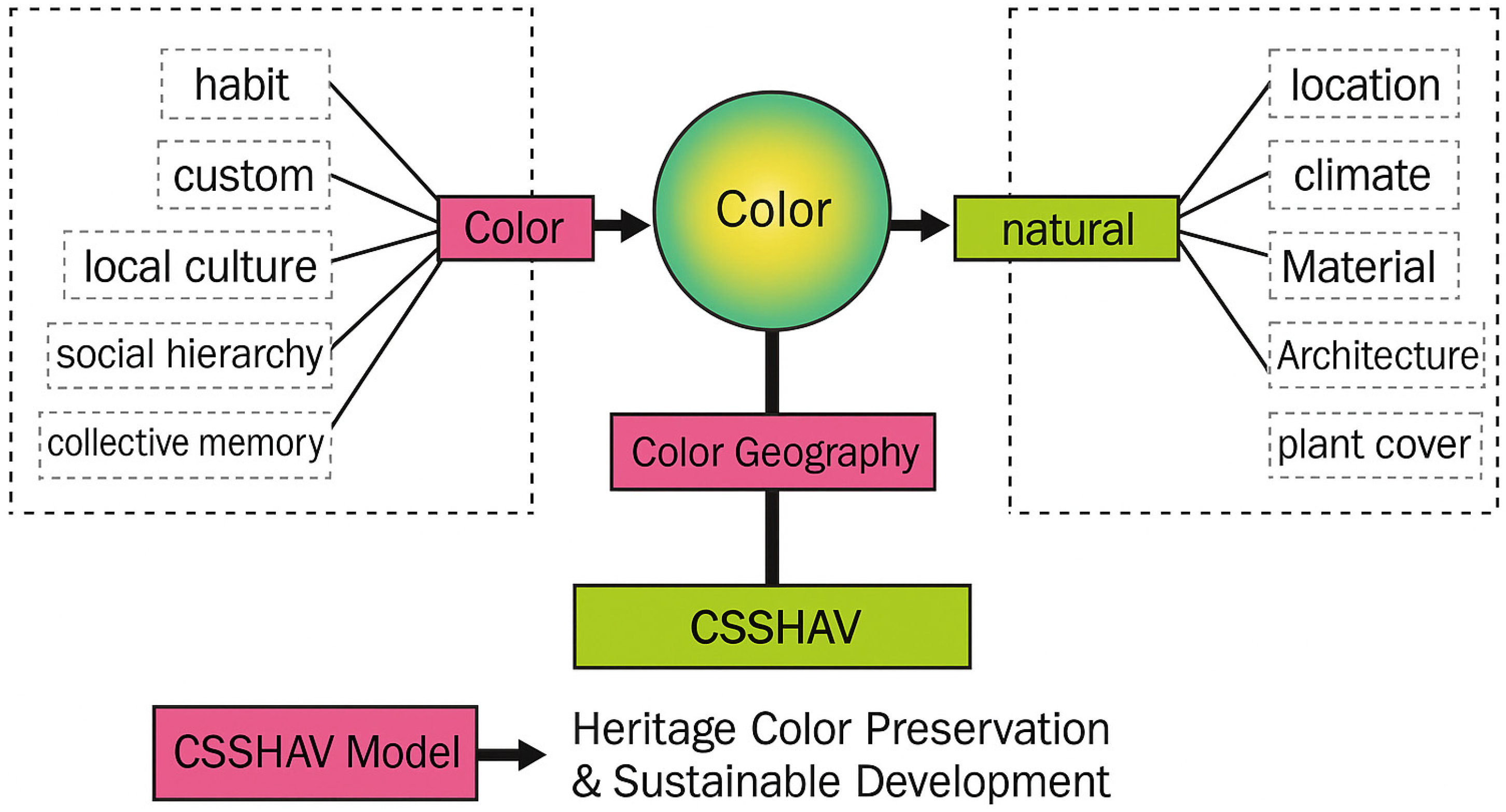 Against this background, the present study aims to develop a color model for ancient villages in Hebei Province based on architectural color elements. The primary objective is to explore how the chromatic identity of Hebei’s ancient villages can reinforce regional identity while supporting cultural preservation and sustainable development. This model seeks to provide theoretical grounding and practical strategies for the protection, transmission, and innovative application of traditional colors. Scheme 1 illustrates the relationship between architectural colors, heritage protection, and the sustainable development of ancient villages.