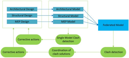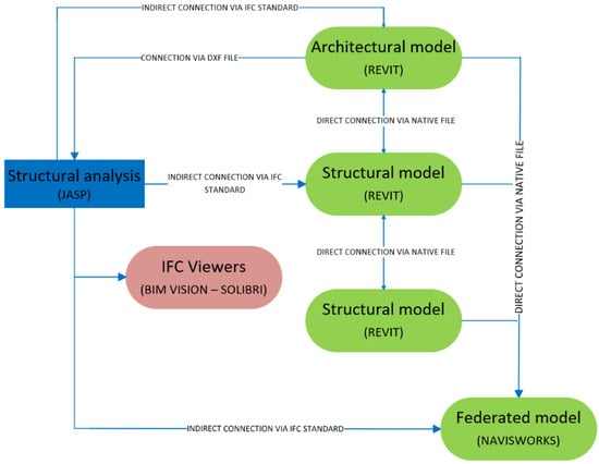 The FEM to BIM information exchange was tested with data transfer between the structural analysis software JASP 7.5® and Revit®, using the IFC standard. The models exported in IFC format were visually checked with IFC viewers BIM Vision® and Solibri Anywhere®, allowing the analysis of informational content. The many-to-one approach was used to generate the federated model, both with direct links with native file and indirect link via IFC format. The federated model was created on Revit® for comparisons and checks during architectural–structural and plant design. Each model created with Revit underwent interference analysis to correct design errors. The transfer of the structural model generated by FEM calculation software in IFC format to Revit® allowed testing the interpretation of information also with the visualization and rendering plug-in Enscape®. An additional federated model was created with Navisworks®, allowing testing of all imported models and performing interference analysis (Figure 1).