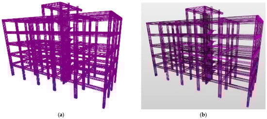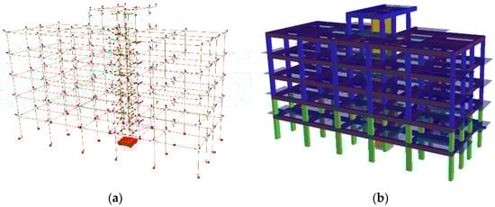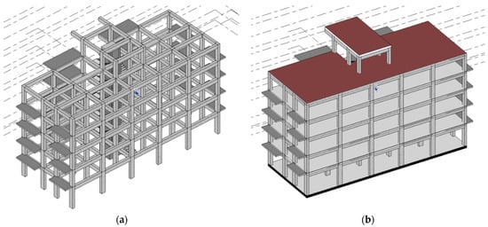 (a) Complete structural frame with cast-in-place hollow core slabs and stairs; (b) Analytical model of the structural frame generated with Revit® v.2021.