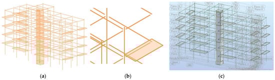 (a) Structural frame on Revit® v.2021 with structural BIM elements; (b) Analysis model on Revit® v.2021—only with axes, nodes, and geometric planes; (c) Analysis model on Robot® v.2021 with axes, nodes, and geometric planes.