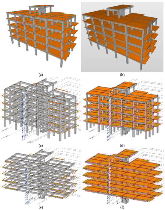 (a) Structural model exported from Revit® v.2021 with slabs; (b) Analytical model imported into PRO_SAP®, with slabs; (c) Structural model exported from Revit® v.2021, without slabs; (d) Analytical model imported into PRO_SAP®, without slabs; (e) Analytical model imported into PRO_SAP®, highlighting the absence of some structural elements.