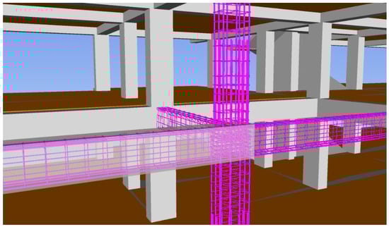 After verifying the correct transfer of information in the structural IFC models, further tests were conducted to evaluate their integration into coordination, clash detection, and analysis software. For this purpose, a geometric clash detection analysis was conducted on the structural IFC models using Navisworks Manage® v.2024 software. The analysis did not reveal any data interpretation errors in the generated structural IFC models. Structural IFC files were simultaneously imported into Navisworks®, allowing the creation of a federated structural model. The integration of the two models enabled the verification of the correct placement of the reinforcements within the concrete structure (Figure 13).