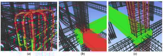 Geometric interferences detected with Navisworks software: (a) between reinforcing bars; (b) between concrete beams; (c) between reinforcing bars and concrete beams.