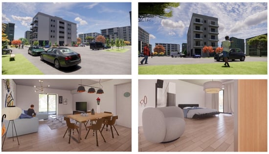 The use of Revit® software for architectural modeling allowed for the identification of inconsistencies and design errors through clash analysis of the model itself. The identification of clashes proved particularly important, as it enabled the resolution of errors during the architectural modeling phase, before sharing the file with other disciplines. Starting from the same BIM model, it is possible to create photorealistic views and, with the aid of specific plug-ins and headsets, visualize the model in Virtual Reality (VR) mode. The model elements already contain all the graphical information related to materials, which are transferred to rendering software to generate photorealistic views. Information transfer tests were conducted, obtaining photorealistic views using the Enscape® v.3.3 plug-in (Figure 18). Through Enscape®, it was possible to integrate the building’s BIM model with furniture and vegetation elements, creating realistic external and internal environments of the completed work.