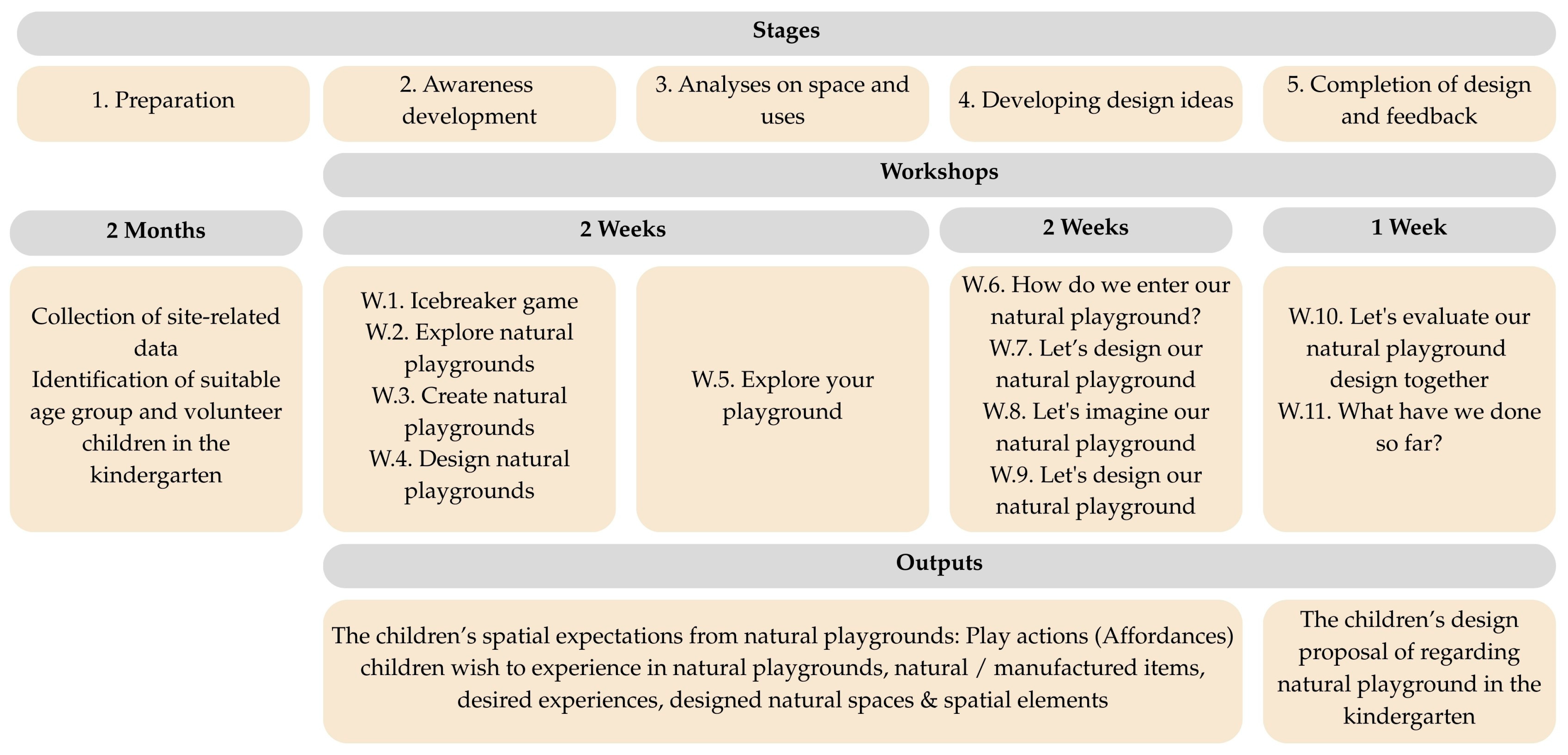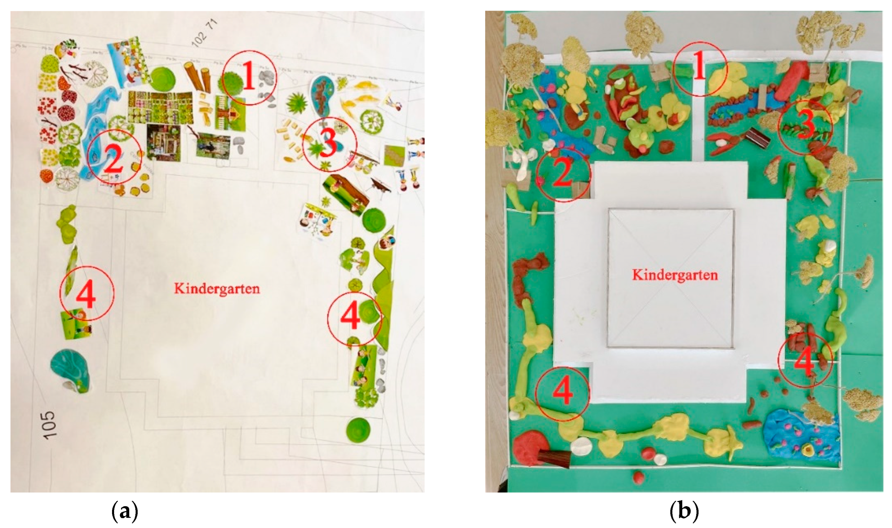- Şahin, B.E.; Polat, S. A participatory design model for children to create natural playgrounds in kindergartens. Child. Youth Serv. Rev. 2025, 1792, 108602. [Google Scholar] [CrossRef]