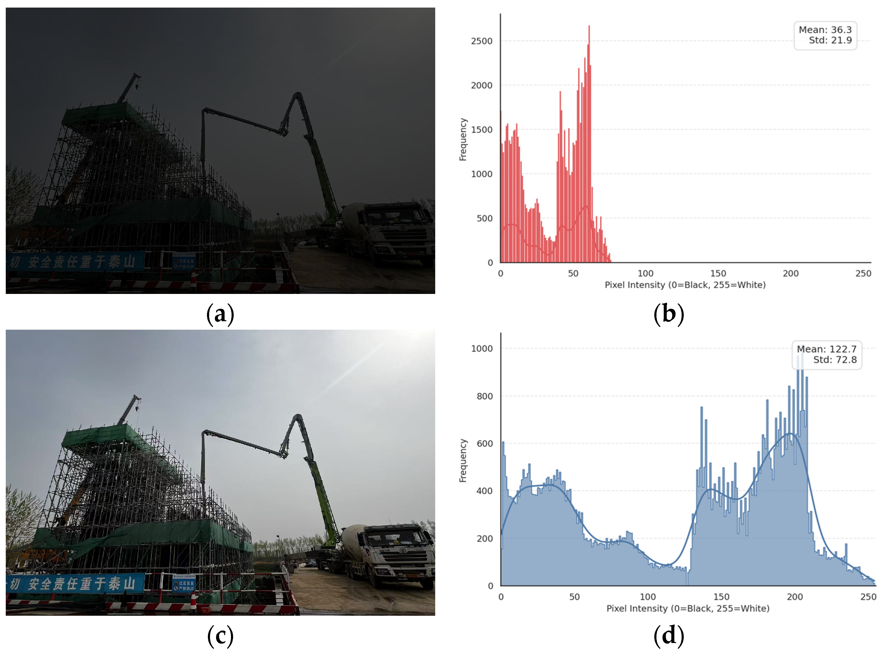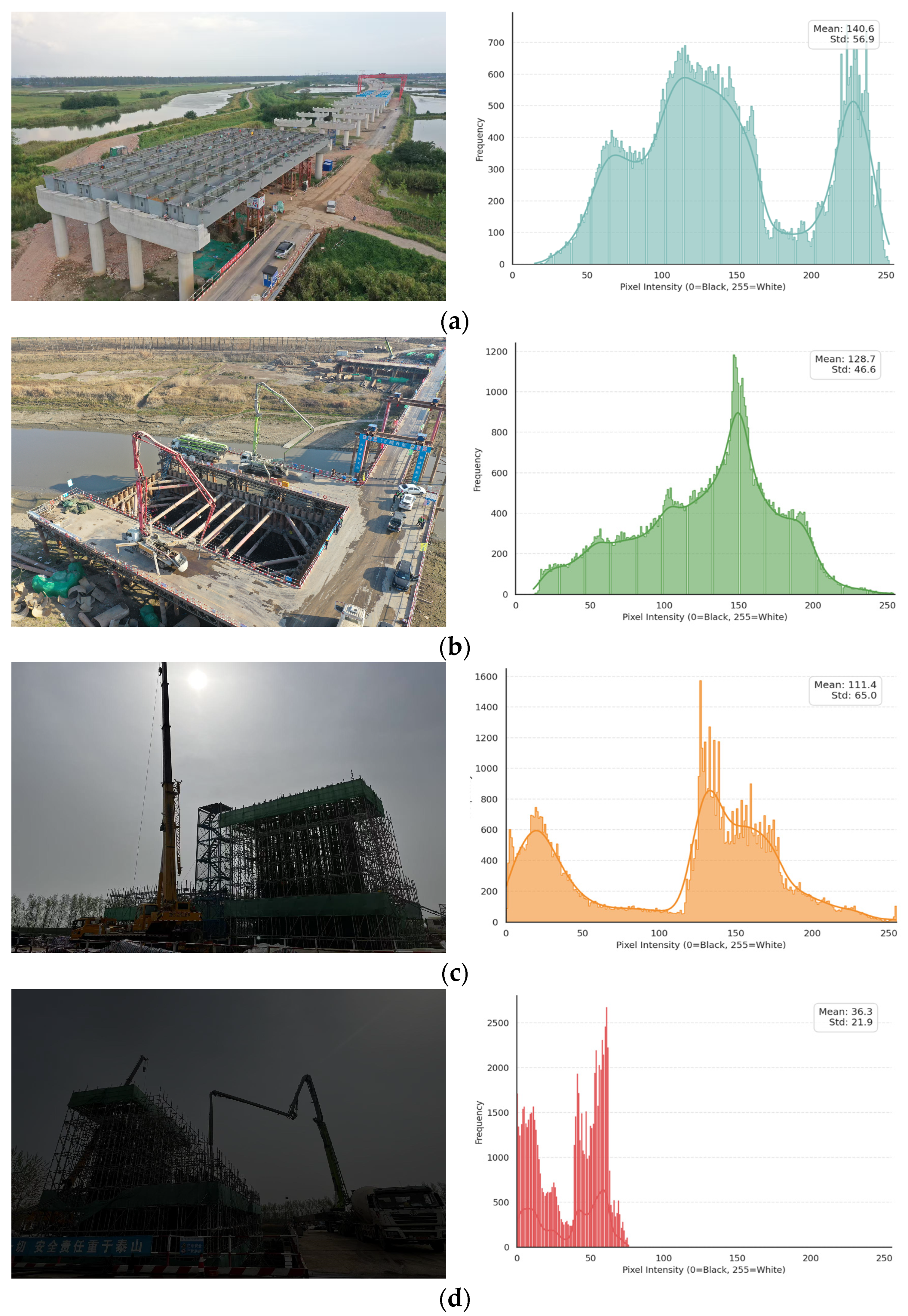 Images collected on site vary markedly in quality because of natural lighting, auxiliary illumination, and occlusions. To analyse the effects of illumination on detection, grayscale histograms were constructed, and the images were grouped into four typical lighting conditions:
