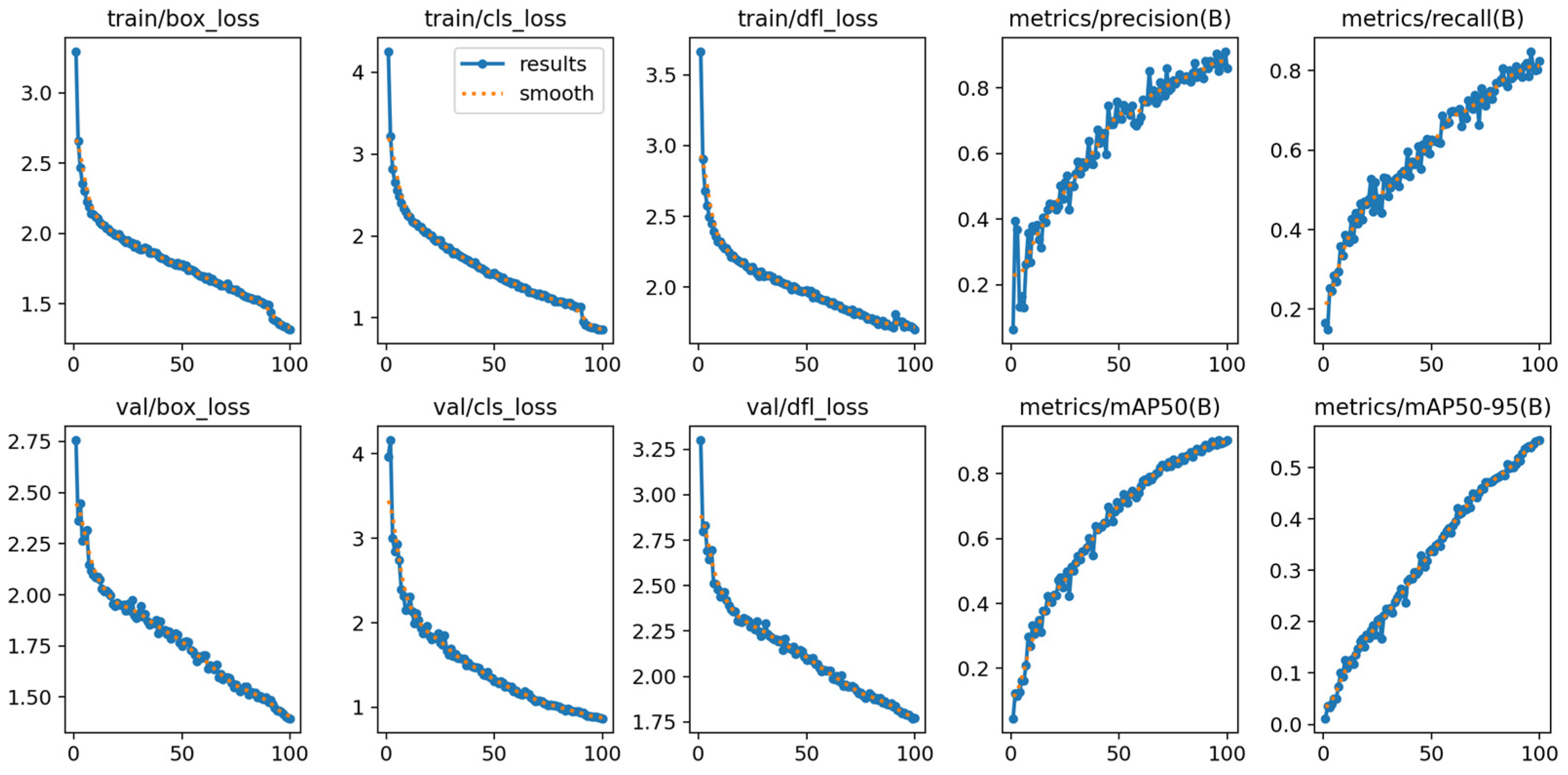 The improved YOLOv8 detector was trained for up to 100 epochs with early stopping on the basis of the validation mAP, and the best checkpoint near the 100th epoch was used for all subsequent experiments. We used stochastic gradient descent (SGD) with an initial learning rate of 0.01, momentum of 0.937, weight decay of 5 × 10−4, and a batch size of 16, together with a cosine learning-rate schedule and three warm-up epochs.