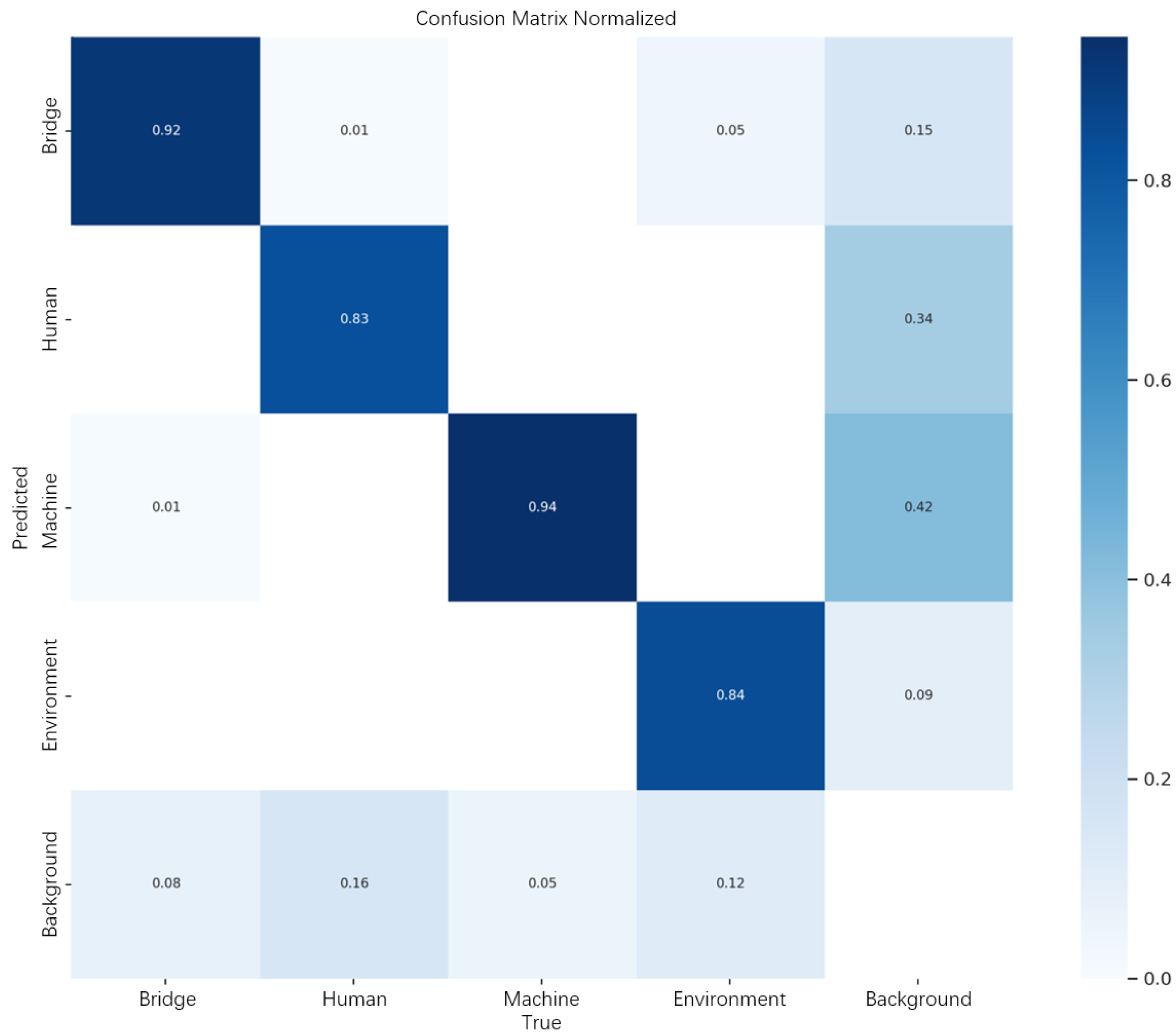Figure 7 has a recall of 0.90 for bridge structures, 0.89 for humans, 0.94 for machinery and 0.88 for the environment, while the background recall reaches 0.87. From a safety perspective, such high recalls for the human- and environment-related categories mean that workers, temporary facilities and protective devices are rarely missed by the detector. This greatly reduces the probability that hazardous situations, such as working at height without adequate guarding or entering poorly protected lifting zones, remain completely unseen in the subsequent causal-chain analysis and DBN-based risk inference.