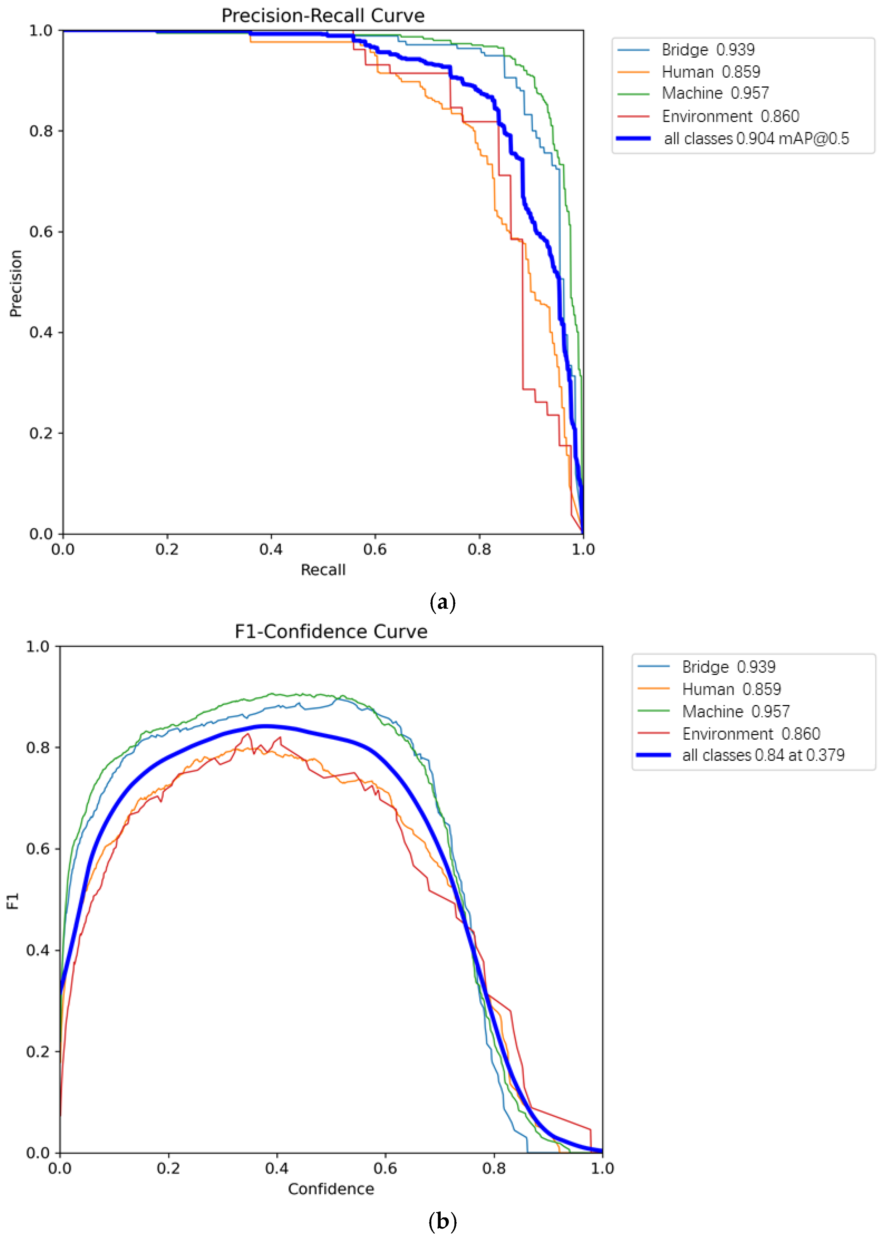 We evaluated the improved YOLOv8 model using standard detection metrics, including classwise precision–recall (PR) curves, F1–confidence curves, mAP, and a four-class confusion matrix (bridge, human, machine, environment). The computation of these metrics follows the procedures described in