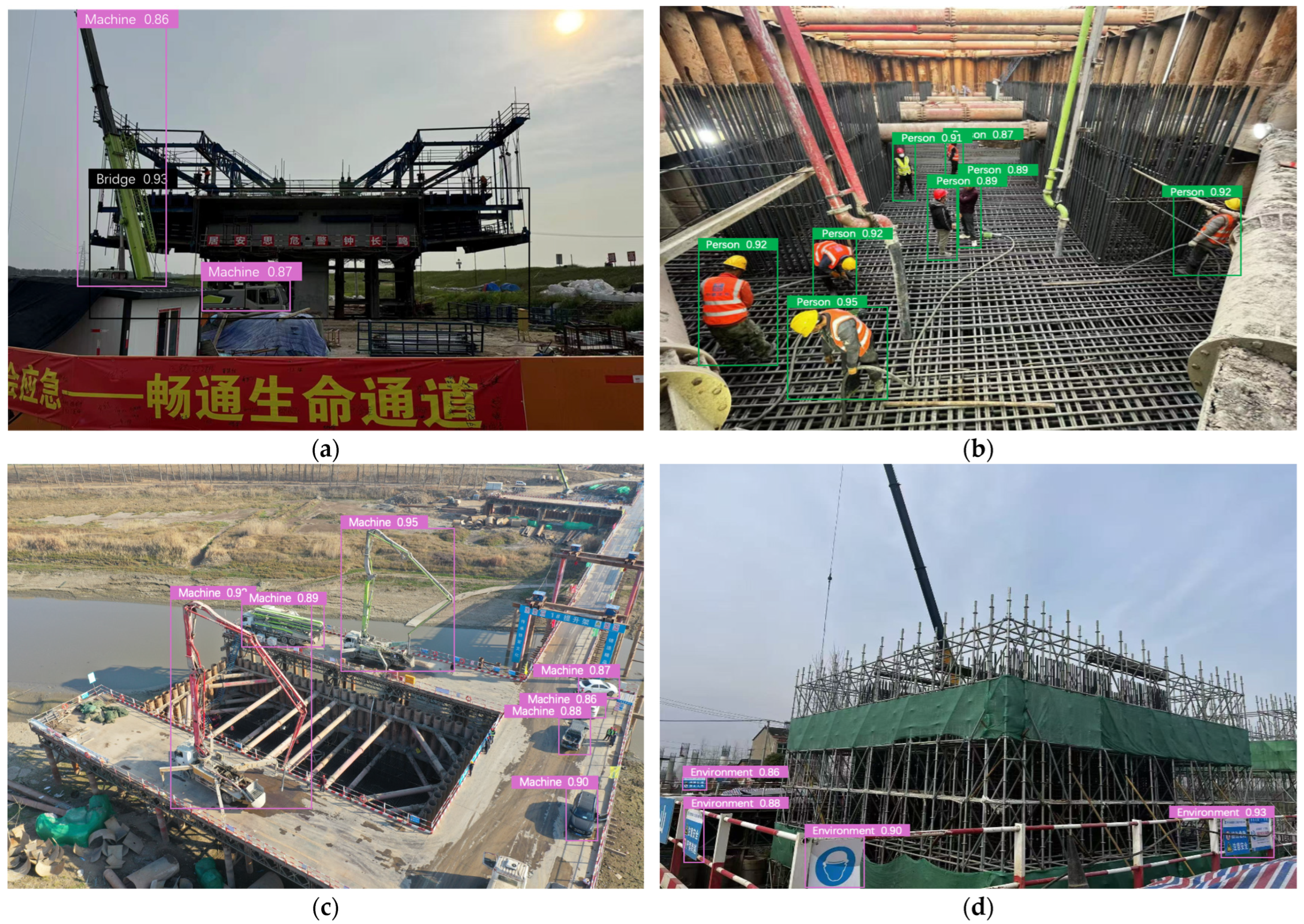 Figure 9. The four categories (‘bridge’, ‘person’, ‘machine’, and ‘environment’) are correctly localized and classified in typical bridge construction scenes, including complex backgrounds and varying illumination conditions. This qualitative validation complements the quantitative validation metrics (loss, precision–recall, and F1–confidence curves) and visually confirms the model’s ability to recognize risk elements in realistic construction scenarios.