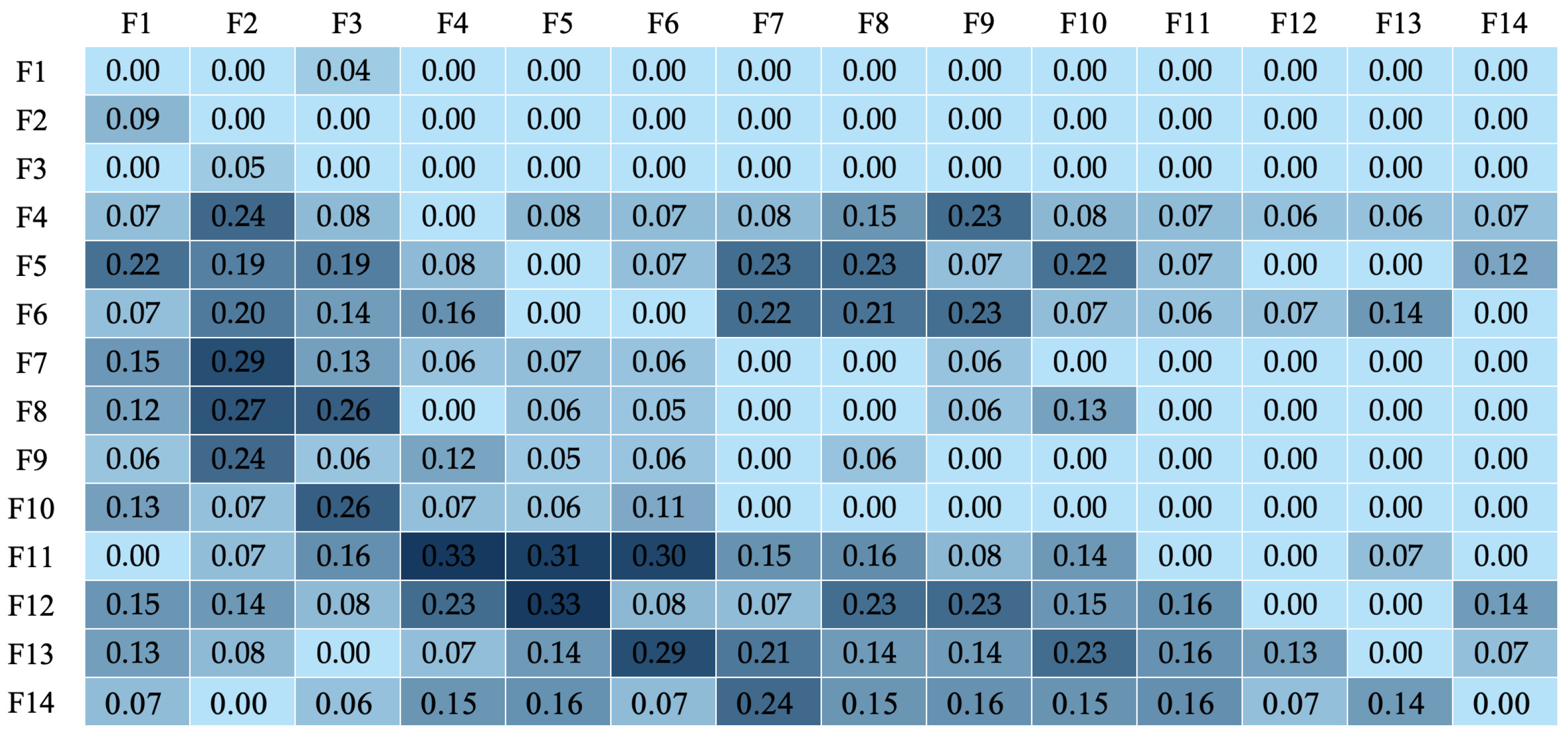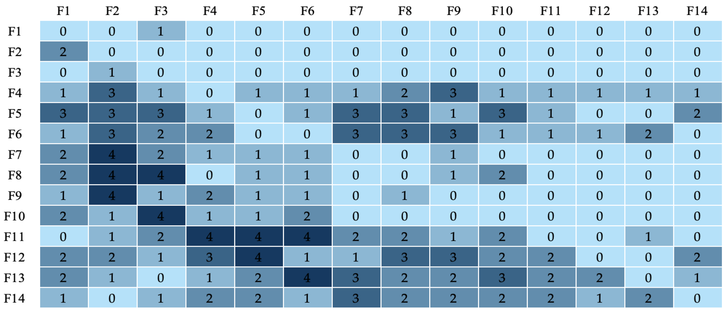 Tij, and small cycles (e.g., among F1–F3) are broken by imposing a construction-stage-consistent ordering (F1→F2→F3) and removing the weakest edge. Thus,