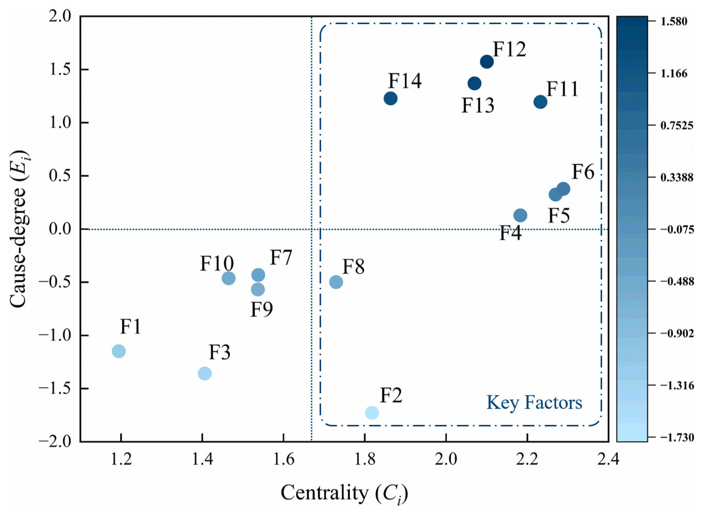 Figure 13, the dotted rectangle encloses ‘key factors’, defined as nodes with prominence Ci above the median and positive causality Ei > 0 (e.g., F5, F6, F11–F14). These factors are both influential and upstream in the network and therefore prioritized for proactive control.