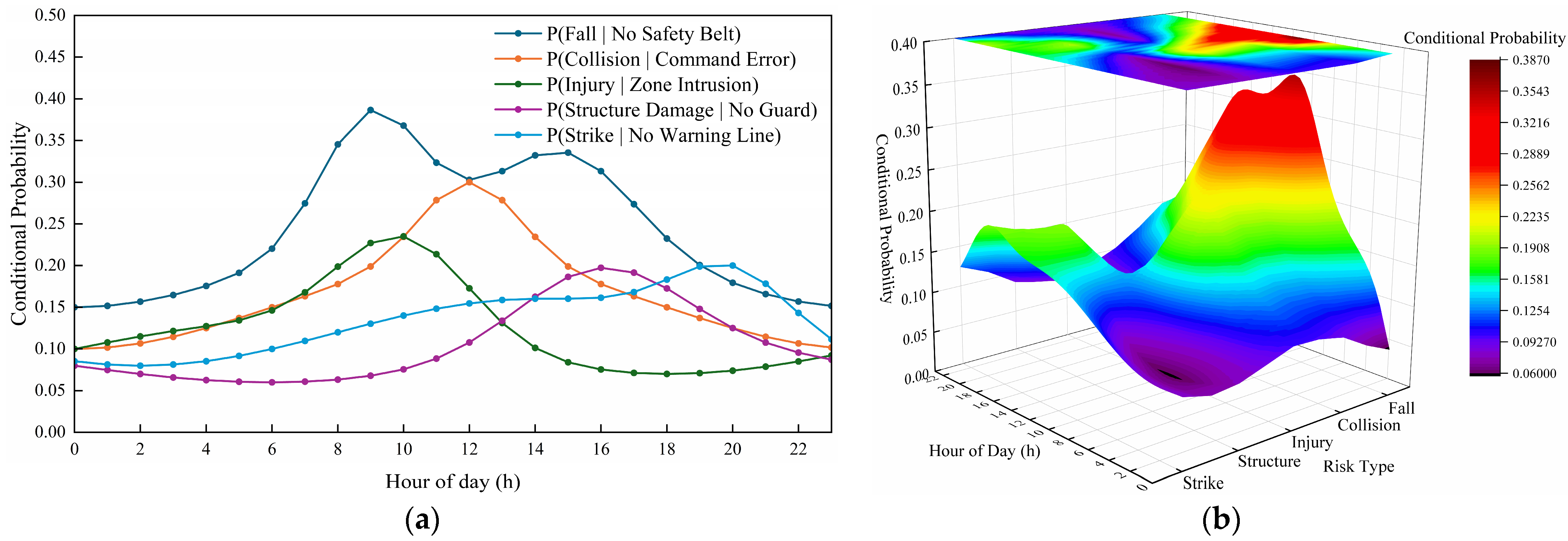 Across the 24 h horizon, the greatest changes in posterior probability occur for human-related nodes (e.g., unprotected personnel and commanders) and environmental nodes (e.g., yard environment and guard line), whereas structural nodes such as bridge piers, cap beams and main beams show relatively small temporal variations. Qualitatively, the predicted daily risk peaks align with the observed rhythms of high-intensity construction tasks and crane and hoisting operations reported in the site logs, and this consistency has been confirmed by onsite experts. This suggests that the DBN captures the main temporal patterns of human- and environment-driven risk, although a formal quantitative validation remains to be conducted.