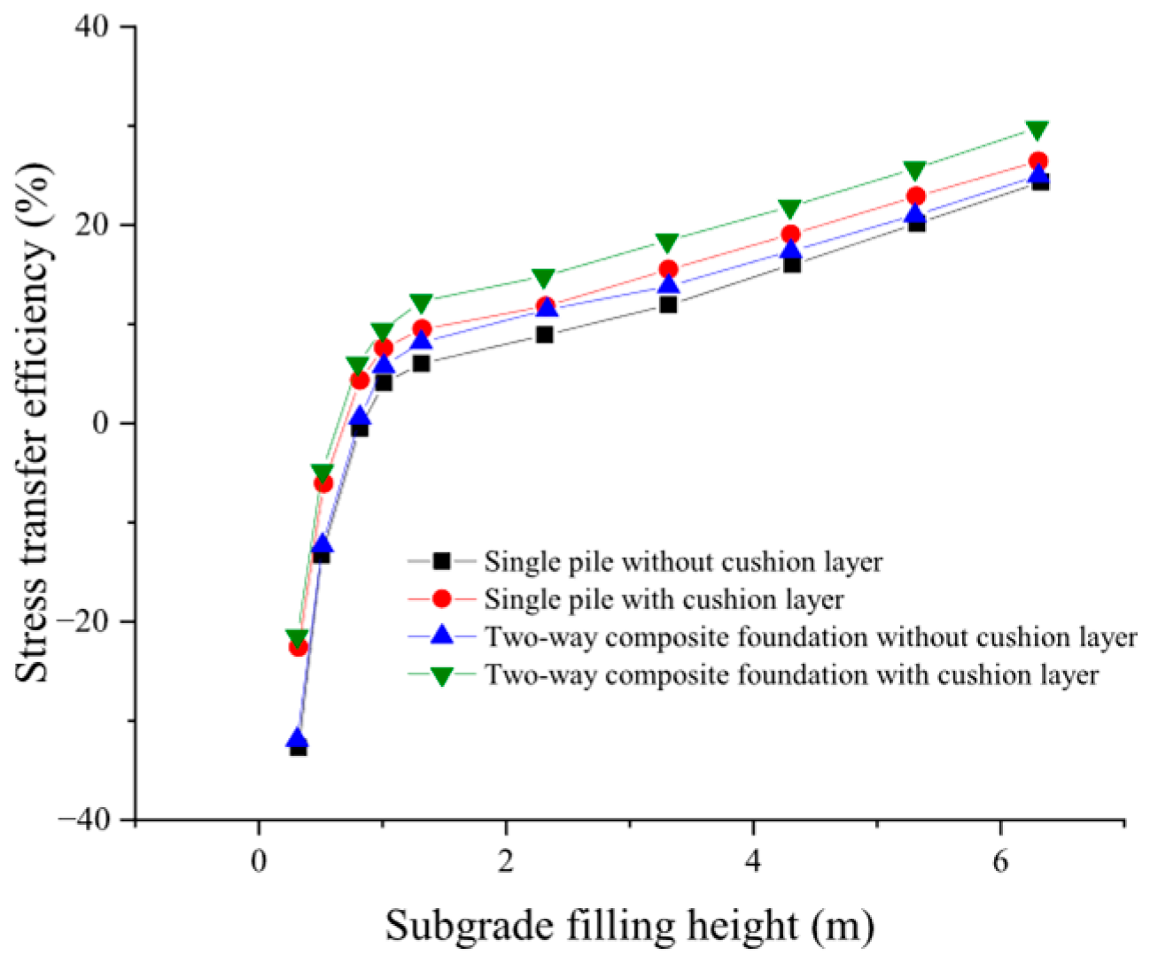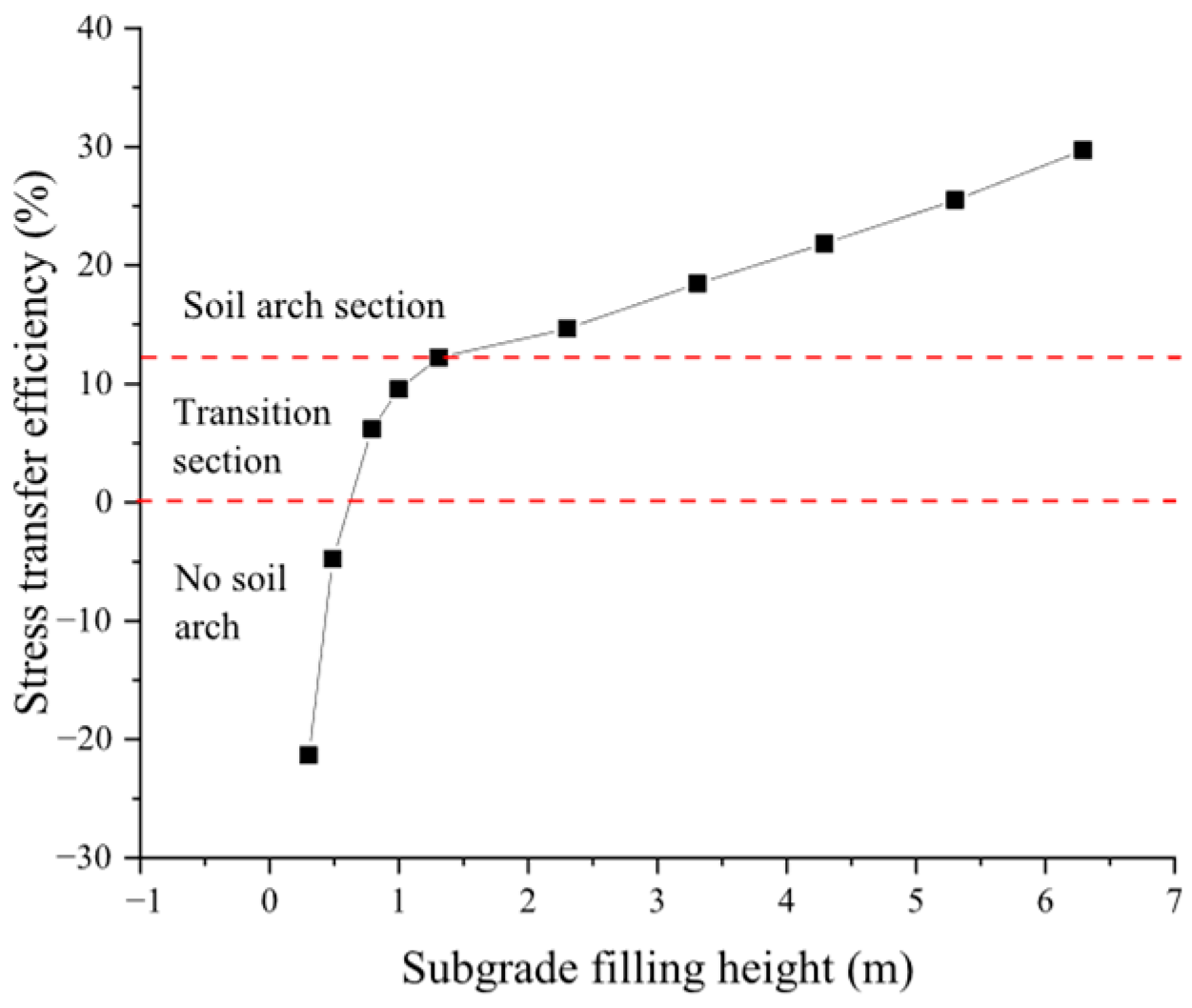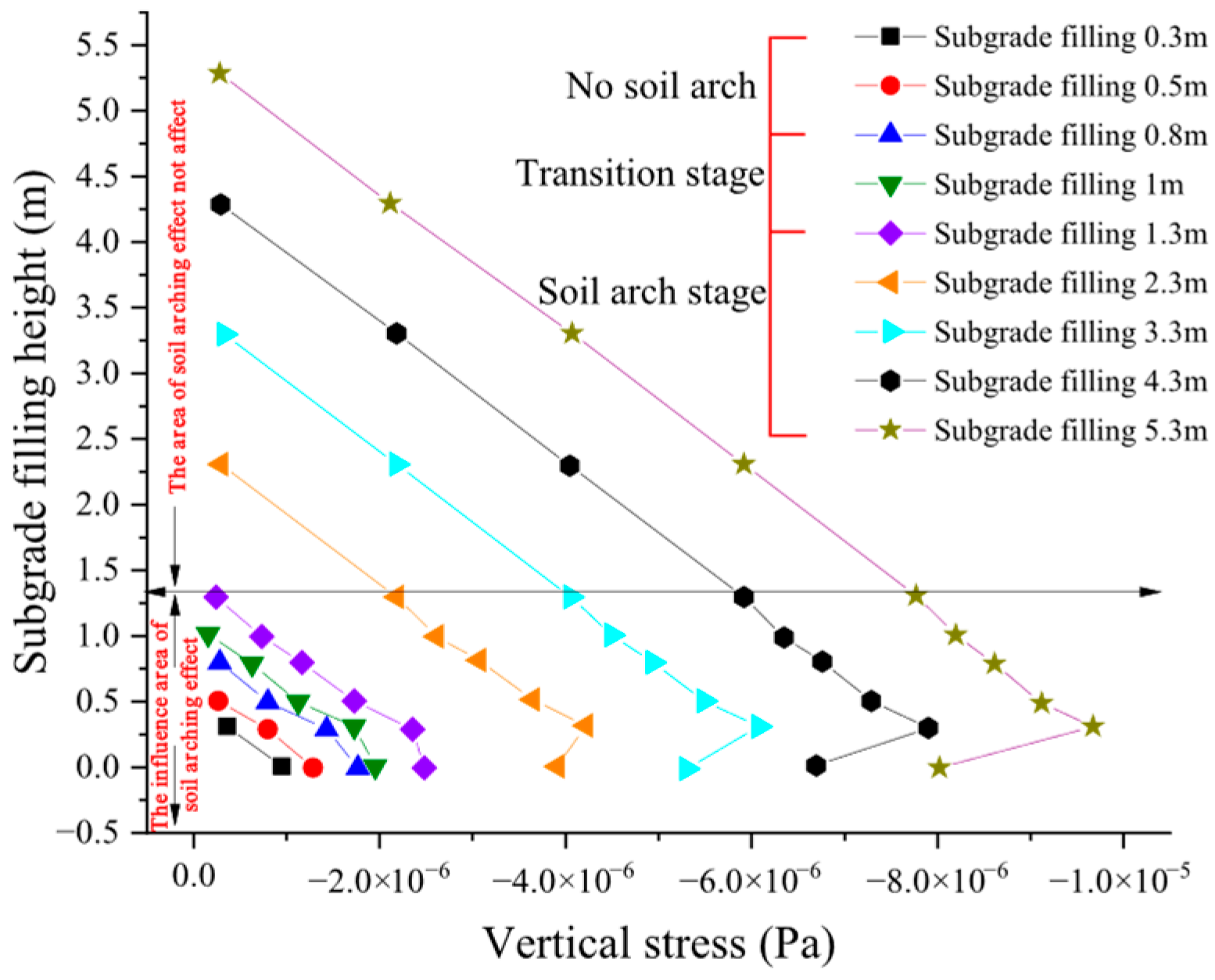 - After the soil arch formed, the subgrade can be divided into two zones: the zone unaffected by the soil-arching effect, where the vertical stress of the subgrade was linearly distributed, and the opposite one, where the vertical stress of soil decreased with depth. It reached the minimum in the surface layer between piles, and the stress distribution was curve. The dividing filling height was about 0.65 times of the pile spacing.