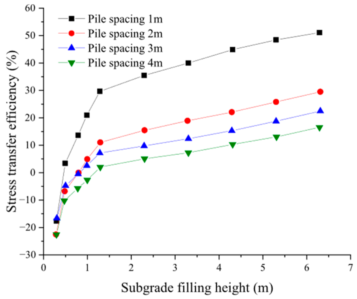 3.3.3. Influence of Reinforcement Form and Pile Spacing on Stress Transfer Efficiency