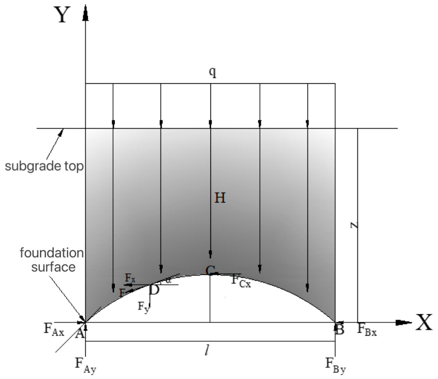 - The weight of soil arch structure is negligible, and the arch thickness is less than its height.