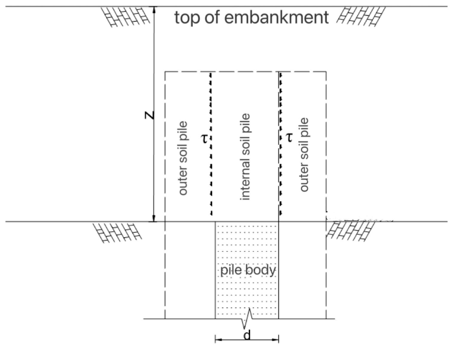 - The lateral friction resistance between the interior and exterior soil columns of the embankment is linearly distributed over the height range between the pile top and the equal settlement surface.