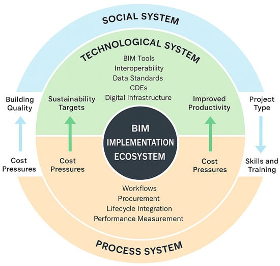 Advancing BIM adoption in Nigeria’s architectural practices requires more than upgrading technologies or enhancing individual competencies; it necessitates an integrated, systematic approach that addresses both the technical and social dimensions of digital transformation [53]. A socio-technical systems (STS) perspective provides this balance by recognising that the success of digital innovation depends on the mutual adaptation between technological tools, human actors, and organisational processes [54,55].