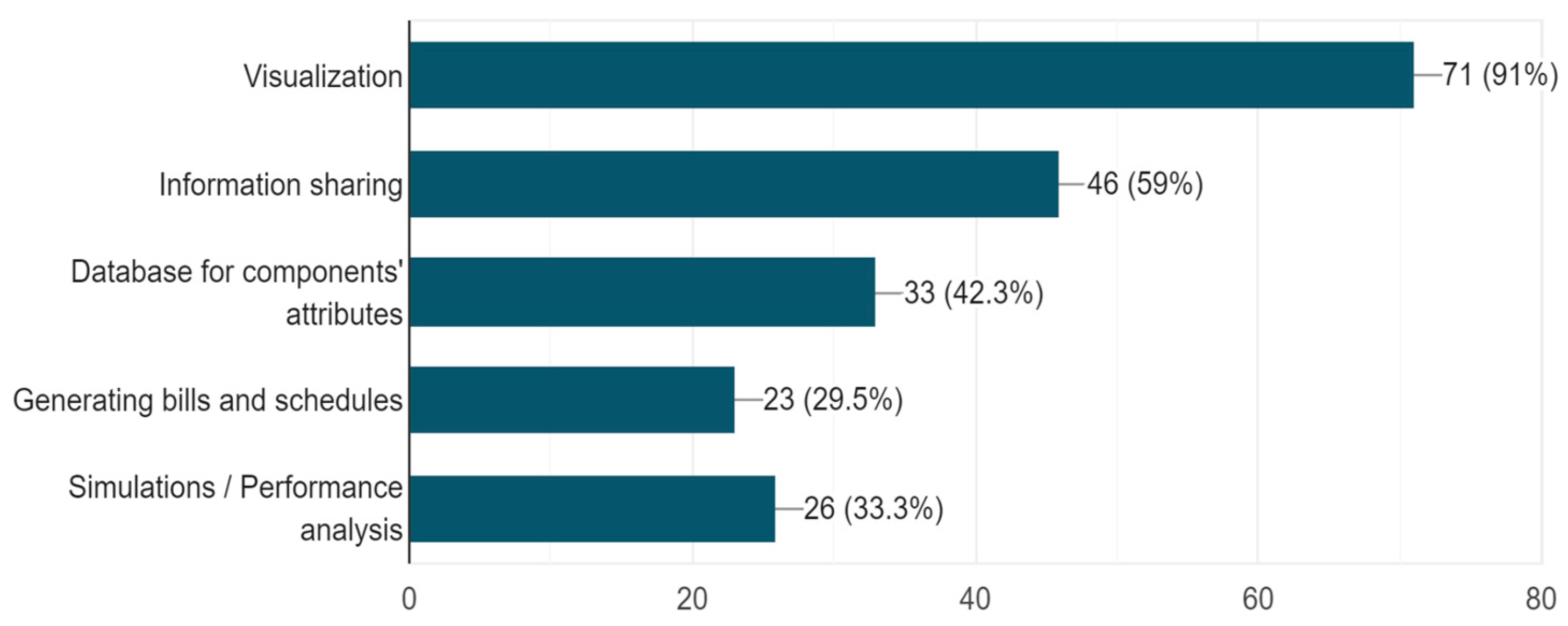 The questionnaire assessed the perceived benefits of BIM among respondents. The most recognized benefit was visualization (91%), followed by information sharing (59%) and database management (42.3%). A smaller proportion identified generation of bills and schedules (29.5%), and simulation/performance analysis (33%) as key advantages (