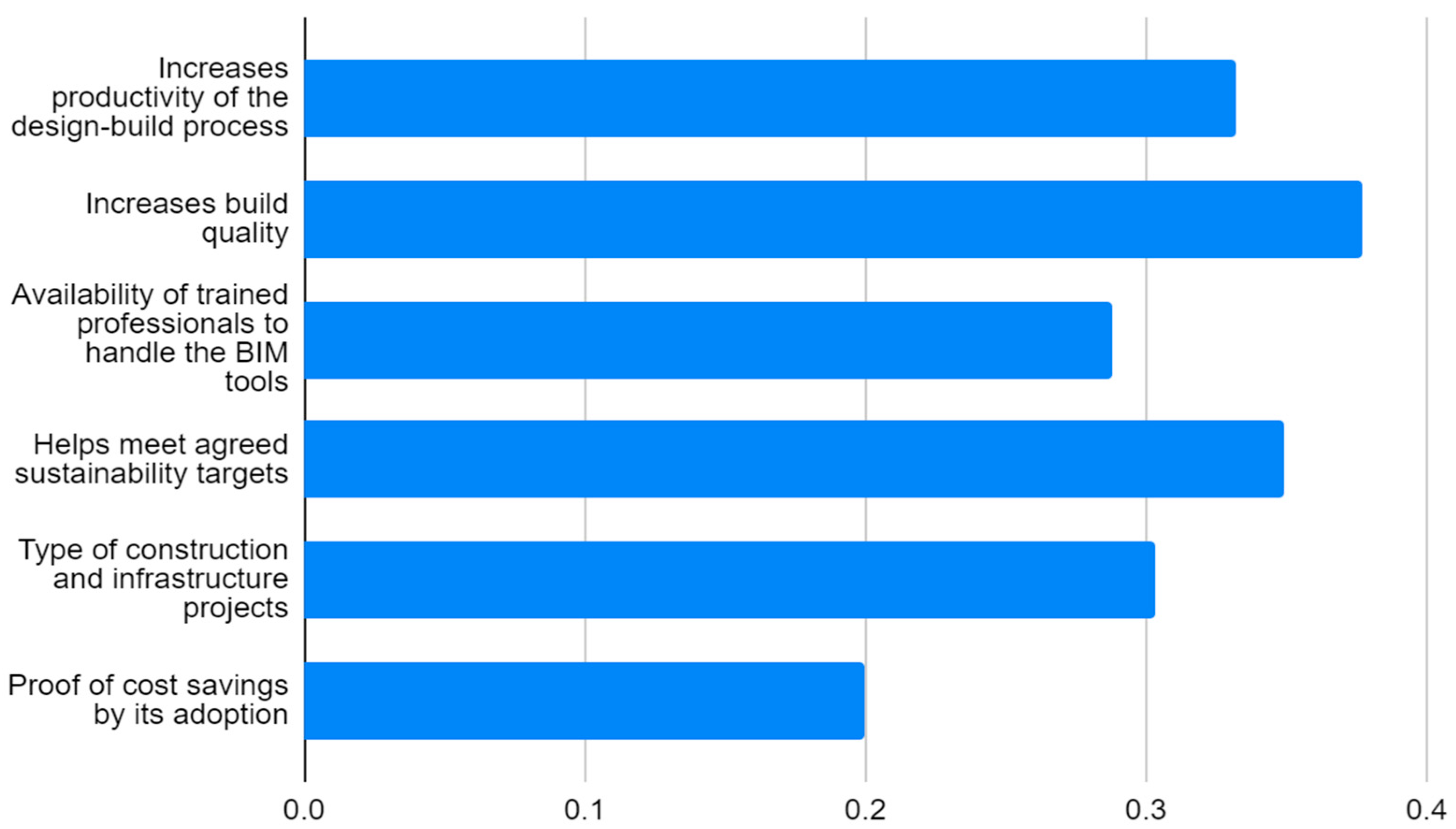 Figure 2 illustrates these correlations, showing that “increases build quality” is the strongest enabling factor, followed by “helps meet agreed sustainability targets” and “increases productivity of the design-build process.” Although still recognised as relevant, “proof of cost savings by its adoption” was identified as the lowest-ranked enabling factor.