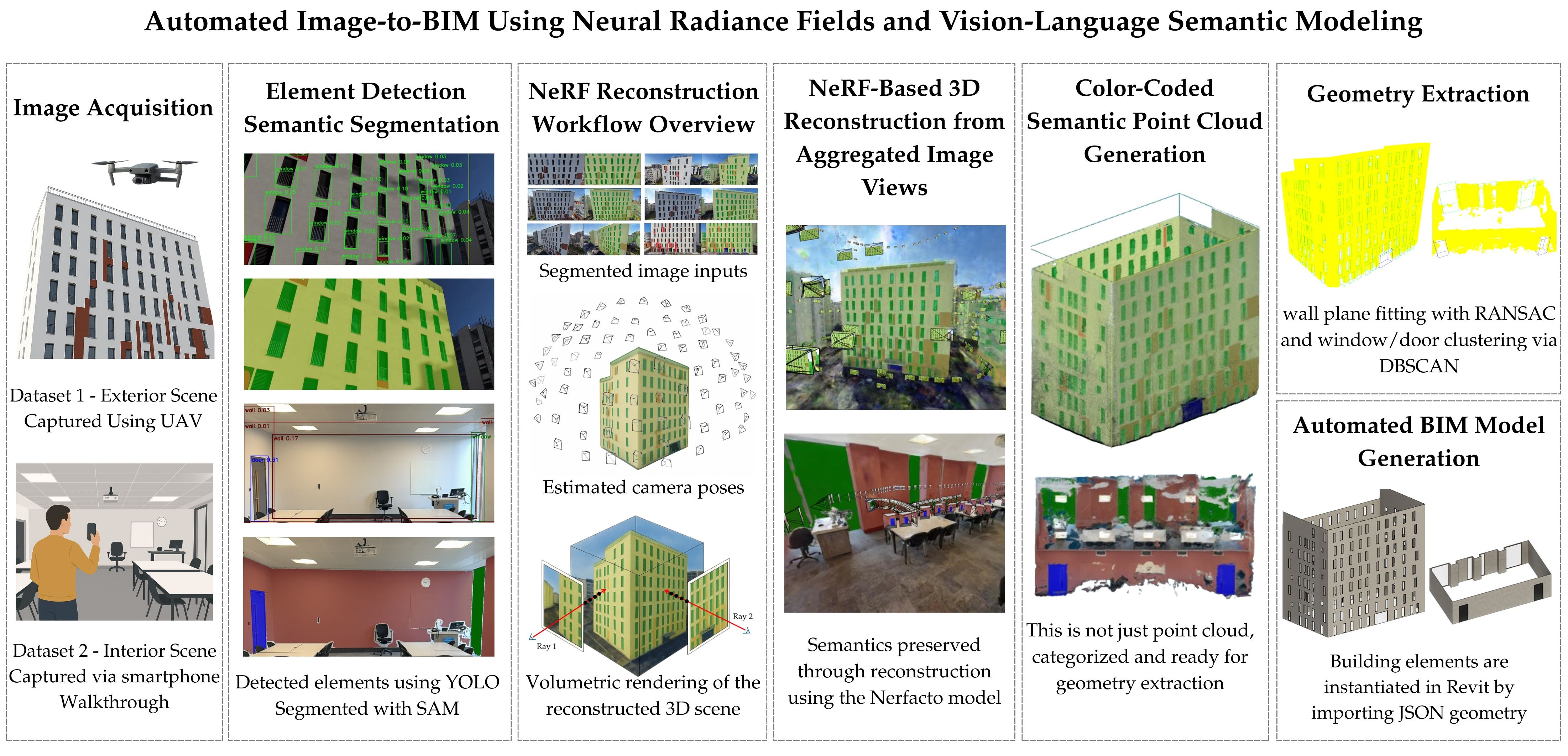 The primary contribution of this work lies in offering a method for automated BIM generation from images using accessible hardware and open-source tools. It bridges critical gaps in the Scan-to-BIM literature by (1) demonstrating that BIM models can be generated from image data alone, eliminating reliance on scanning equipment by producing PCs directly from RGB images using NeRF volumetric rendering. This is achieved by integrating object-level semantic segmentation with NeRF-based 3D reconstruction in a unified method, allowing the system to learn spatial structure directly from labeled RGB inputs rather than relying on traditional photogrammetry or LiDAR-based scans; (2) demonstrating, for the first time, how semantic identity can be embedded into NeRF-based volumetric reconstruction and subsequently extracted as structured geometric data for BIM modeling. This removes the need for post-reconstruction segmentation by embedding semantic labels at the pixel level during preprocessing using computer vision-language techniques. These labels are preserved throughout the rendering process, eliminating projection-based mapping that might lead to misalignment and inconsistency, and ensuring that each building element retains its identity from image input to final BIM output; and (3) developing the workflow from image acquisition to BIM output without requiring domain-specific training data. The extracted geometry is serialized in a structured JSON format and directly imported into Revit, enabling automation of BIM model creation based on the building elements embedded semantic and geometric attributes.