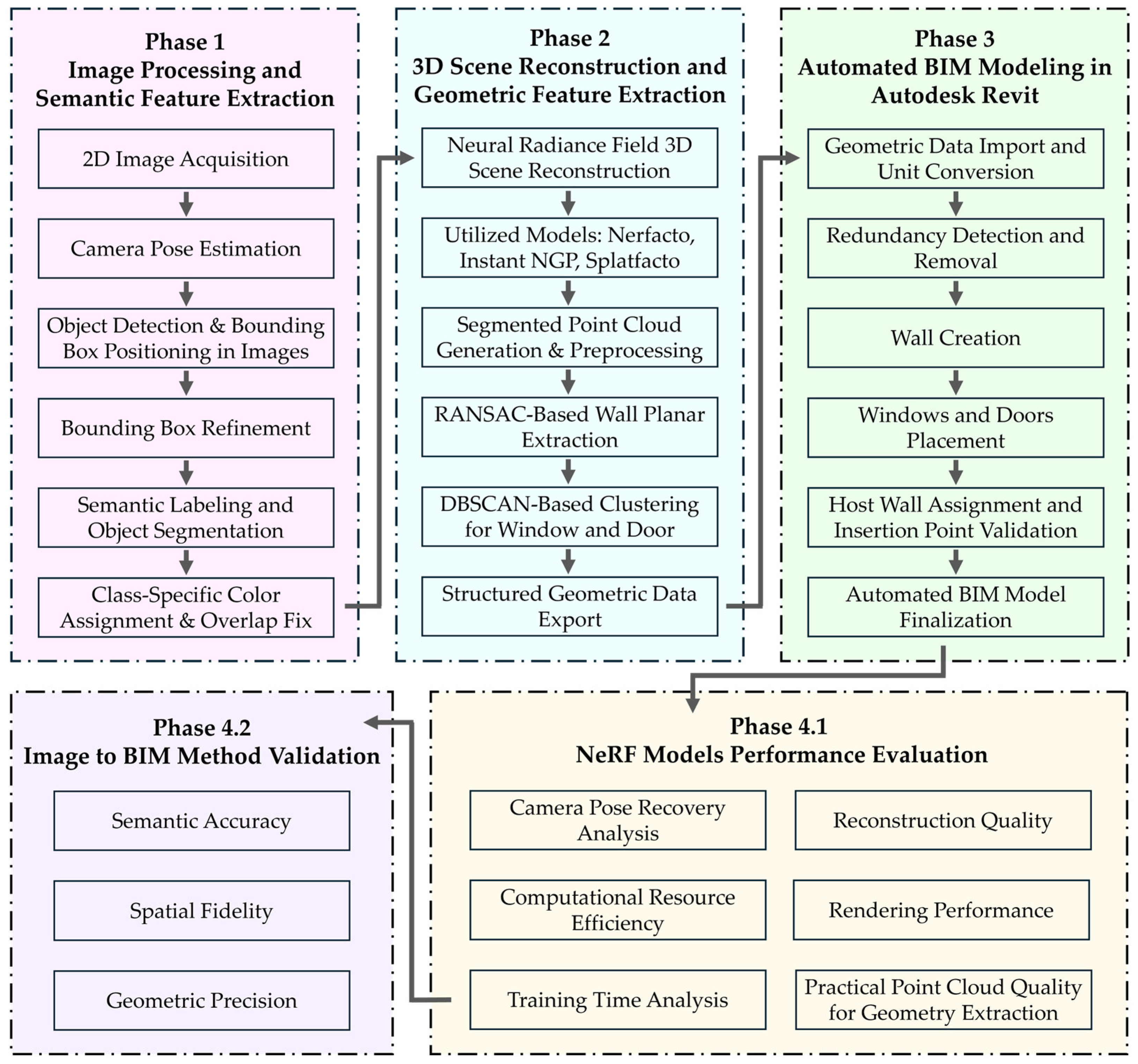 66] extended this to a three-stage process combining NeRF reconstruction, fine-tuned PointNeXt segmentation on synthetic BIM-derived datasets, and BIM generation; however, it still relied on labeled PCs and separate training steps. Similarly, Li et al. [