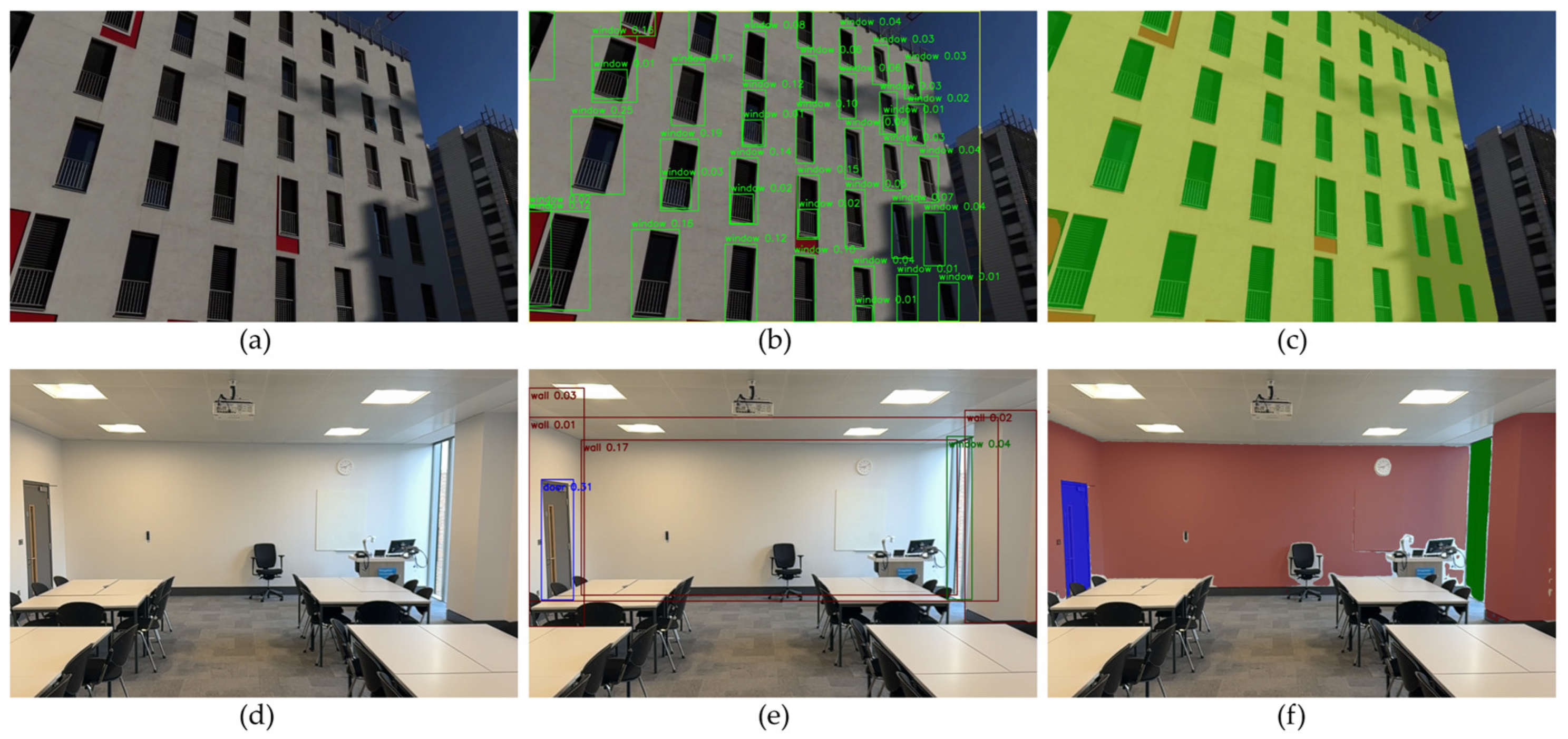Table 2 presents the number of doors and windows in the analysis of the semantic feature extraction results in both datasets. The proposed method correctly identified all architectural elements: 248 windows and four doors in Dataset 1, and 4 windows and two doors in Dataset 2. This perfect match with the ground truth highlights the reliability of the element detection process and confirms the method’s ability to maintain semantic precision across different scene types.