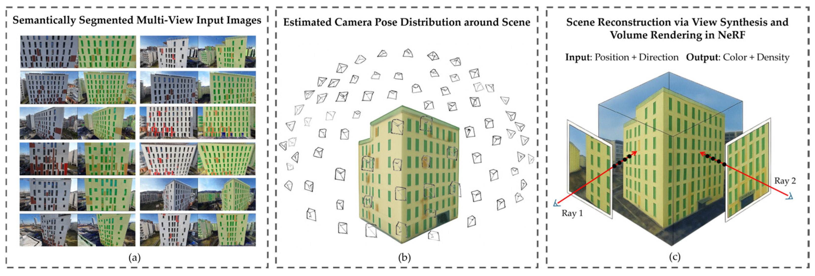 68] adopted Gaussian Splatting to generate high-fidelity meshes for heritage documentation but without semantic or BIM automation. In contrast, the proposed method explicitly advances this line of research by bypassing PC post-processing, embedding semantic information directly at the image level before NeRF training. This early-stage semantic integration allows class labels to propagate throughout the 3D reconstruction, resulting in PCs that are already color-segmented and labeled during generation. Consequently, precise geometry extraction can be performed without additional segmentation or manual refinement, thereby achieving a higher degree of automation and practical efficiency than previous NeRF-based approaches.
