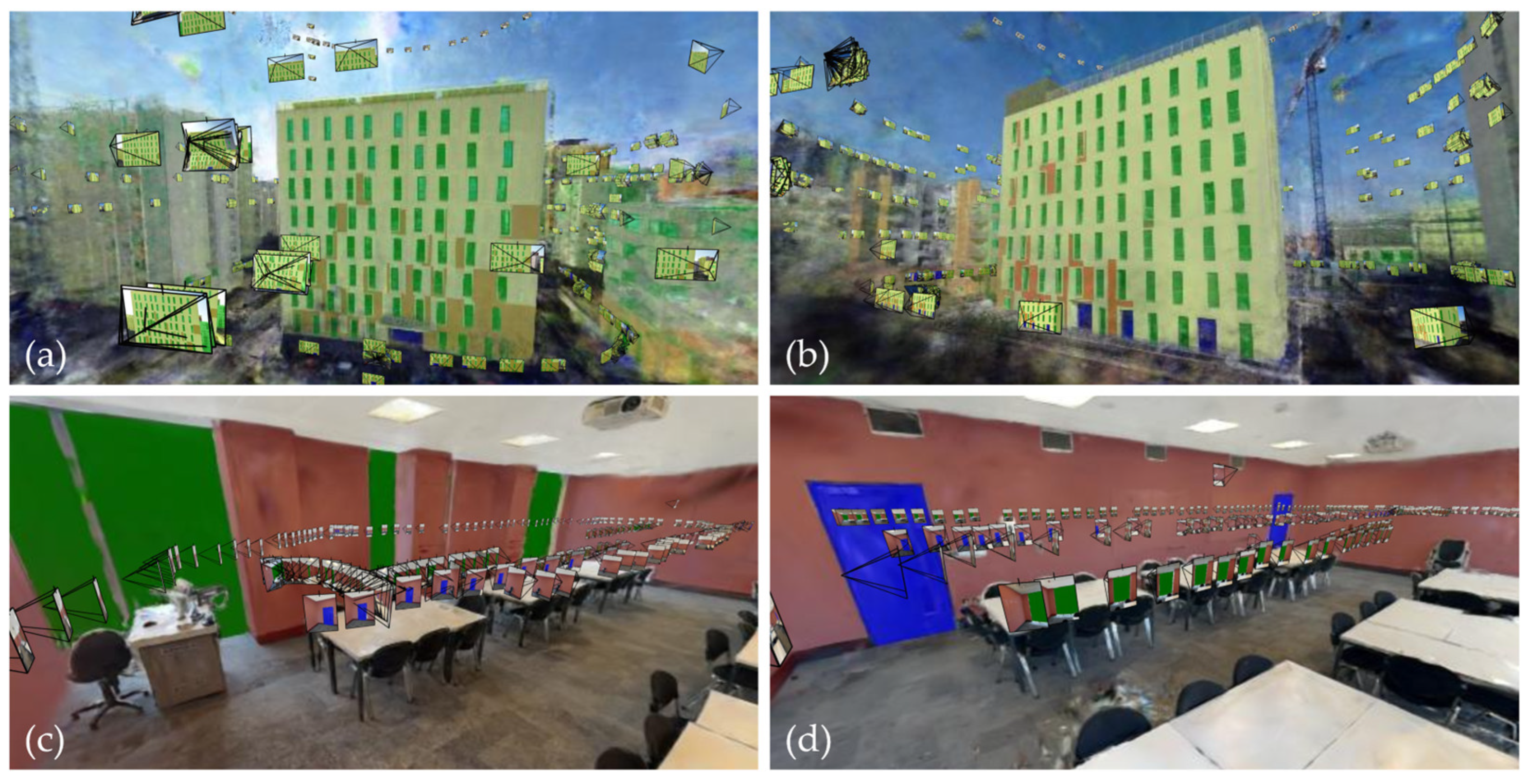 Figure 6, the reconstruction process using segmented images enables precise label transfer and results in a successful reconstructed 3D scene where building elements such as walls, windows, and doors are preserved across the scene with their predefined colors. Building on this labeled reconstruction,