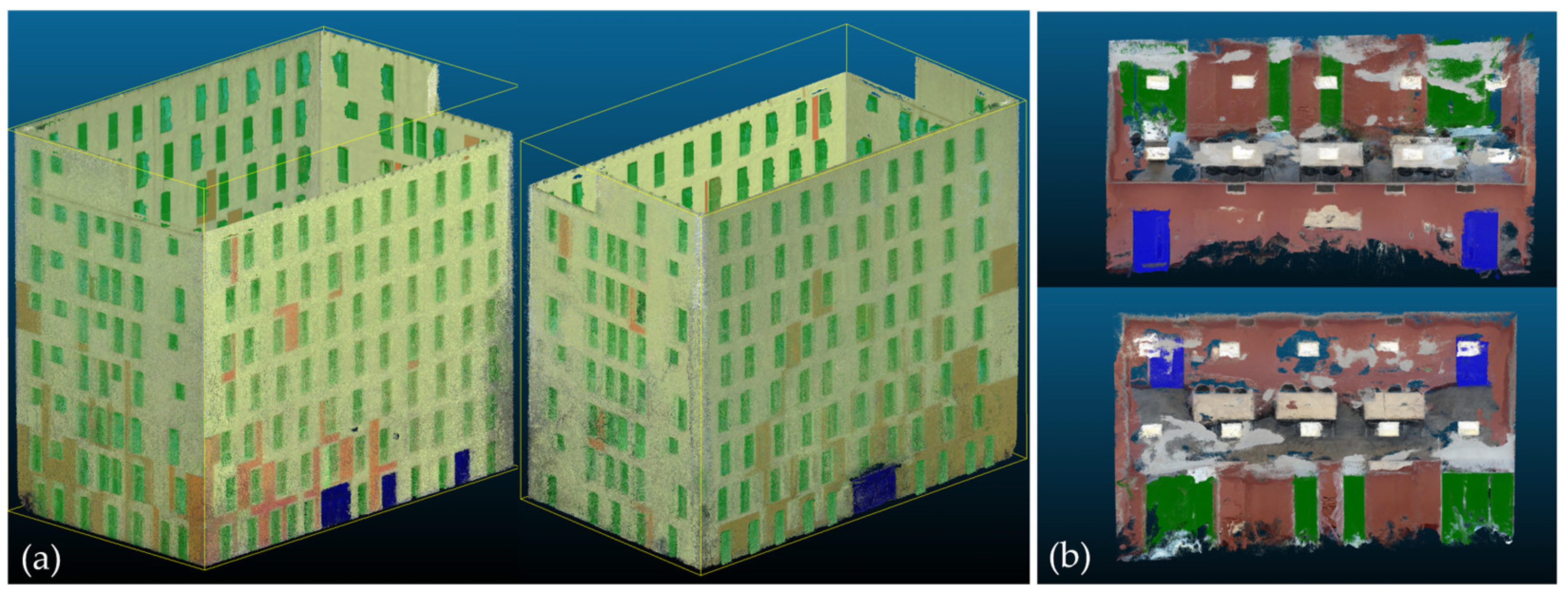 Figure 7 displays the exported color-labeled PCs, which serve as the input for subsequent processing. Geometric features are then extracted through wall plane fitting and object clustering, as illustrated in