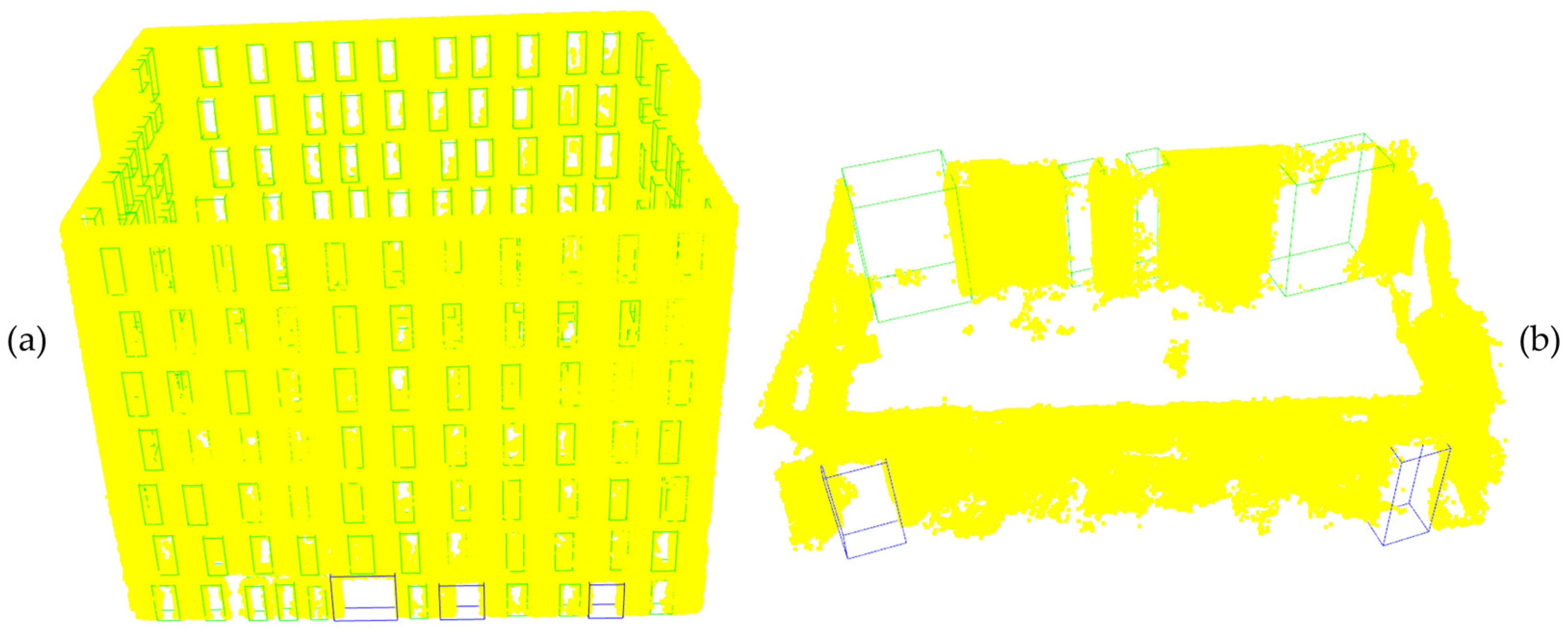 29] extended these efforts with a two-phase methodology that combined planar segmentation and voxelization to detect walls, floors, and ceilings, with visibility reasoning and shape estimation for semantic enrichment of detections.