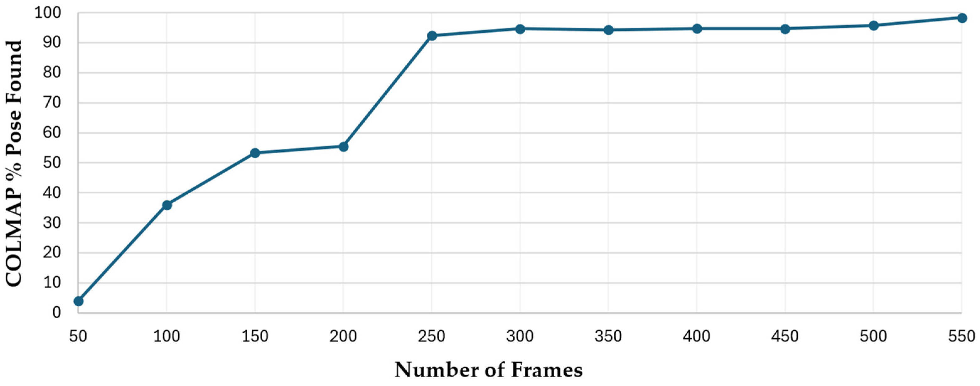 Figure 11, the percentage of successfully recovered poses increases significantly with an increasing number of input frames. With 50 frames, COLMAP recovered just 4% of camera poses. The recovery rate gradually improves, reaching 36% at 100 frames and 55.5% at 200. A sharp increase occurs between 200 and 250 frames, where pose recovery exceeds 92%. Beyond this point, the performance plateaus, with recovery stabilizing between 94% and 98% from 250 to 550 frames. Notably, Nerfstudio’s default setting for frame extraction from video datasets is approximately 300 frames, which, based on these results, offers sufficiently high pose coverage for reliable NeRF reconstruction in many cases. In this study, 550 frames were used to ensure near-complete pose recovery for the exterior scene and to support the generation of dense and accurate 3D models.