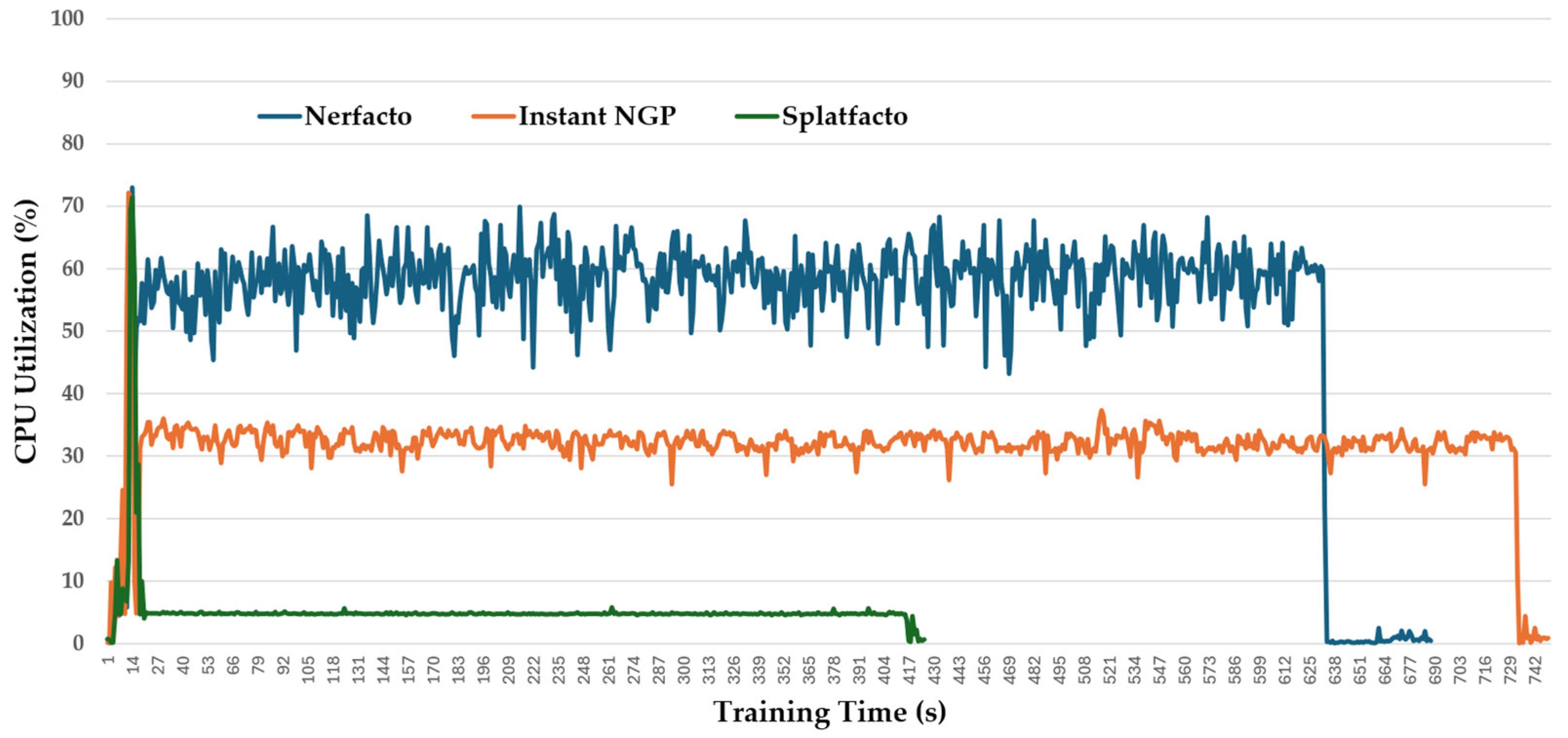 Figure 12 shows that CPU usage was highest for Nerfacto, which utilized an average of 52.9% of the CPU. Instant-NGP showed moderate usage at 31.4%, while Splatfacto maintained the lowest CPU load with an average of 5.3%. This highlights that Nerfacto’s volumetric pipeline and scene encoding require more CPU resources, whereas Splatfacto, driven primarily by GPU-based rasterization, places minimal demand on the CPU.