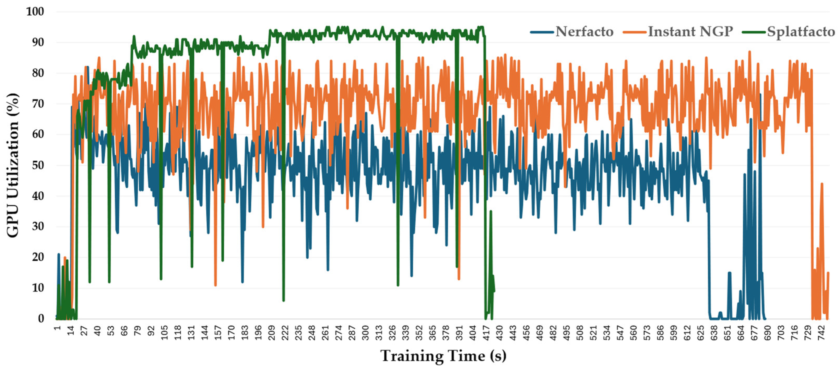 Figure 13, paint a different picture. Splatfacto demonstrated the highest average GPU usage at 81.7%, maintaining a high level of utilization throughout training. Instant-NGP followed with 66.9%, while Nerfacto averaged 45.8%. These values reflect the models’ varying reliance on GPU-intensive operations, with Splatfacto showing strong dependence on GPU rendering via Gaussian Splatting.