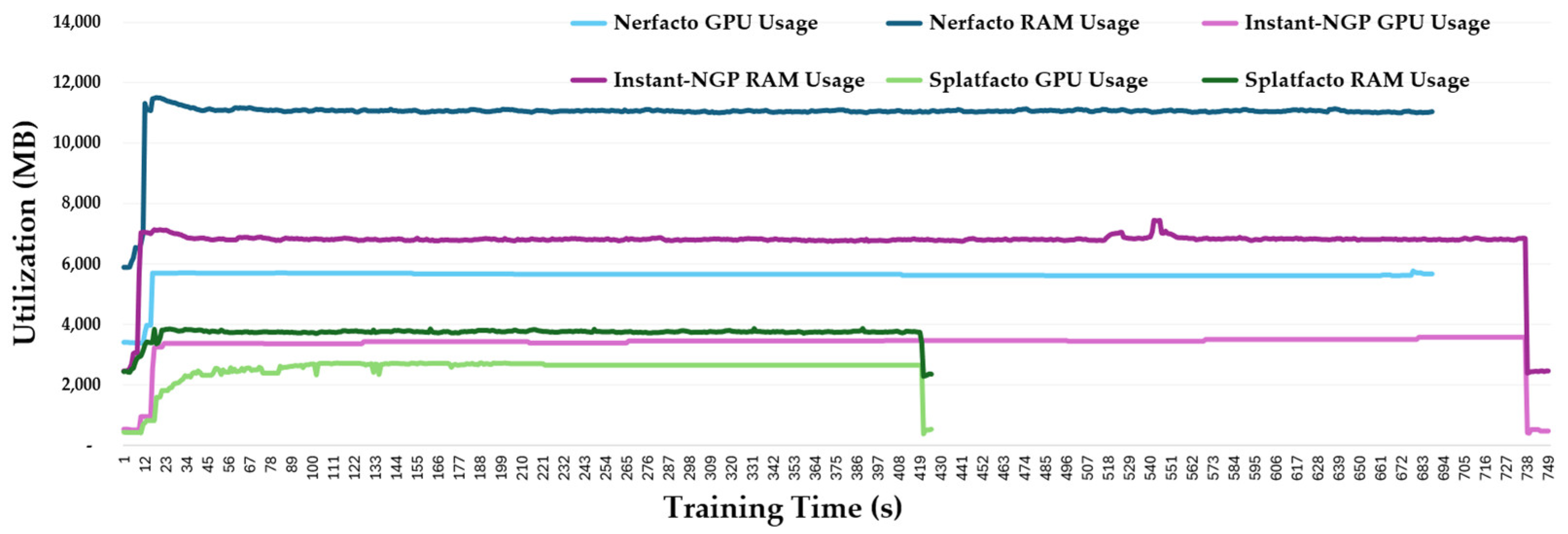 Figure 14 combines both RAM and GPU memory usage across the training period. GPU memory consumption was lowest for Splatfacto, averaging 2.5 GB, followed by Instant-NGP at 3.3 GB and Nerfacto at 5.6 GB. In terms of RAM usage, Splatfacto again showed the smallest footprint with an average of 3.7 GB. Instant-NGP used approximately 6.7 GB, while Nerfacto maintained the highest RAM usage at around 11 GB throughout the training process. These observations highlight Splatfacto’s system and GPU memory efficiency, making it well-suited for resource-constrained environments.
