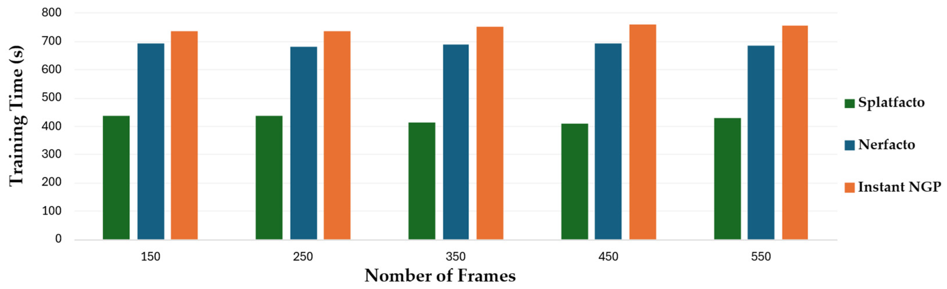 Overall, the comparison highlights Splatfacto as the most time-efficient model in this setup, offering rapid training regardless of input size. Interestingly, the number of input frames had a minimal impact on the overall training time for any evaluated models. Each model maintained a consistent training duration despite varying the dataset size.