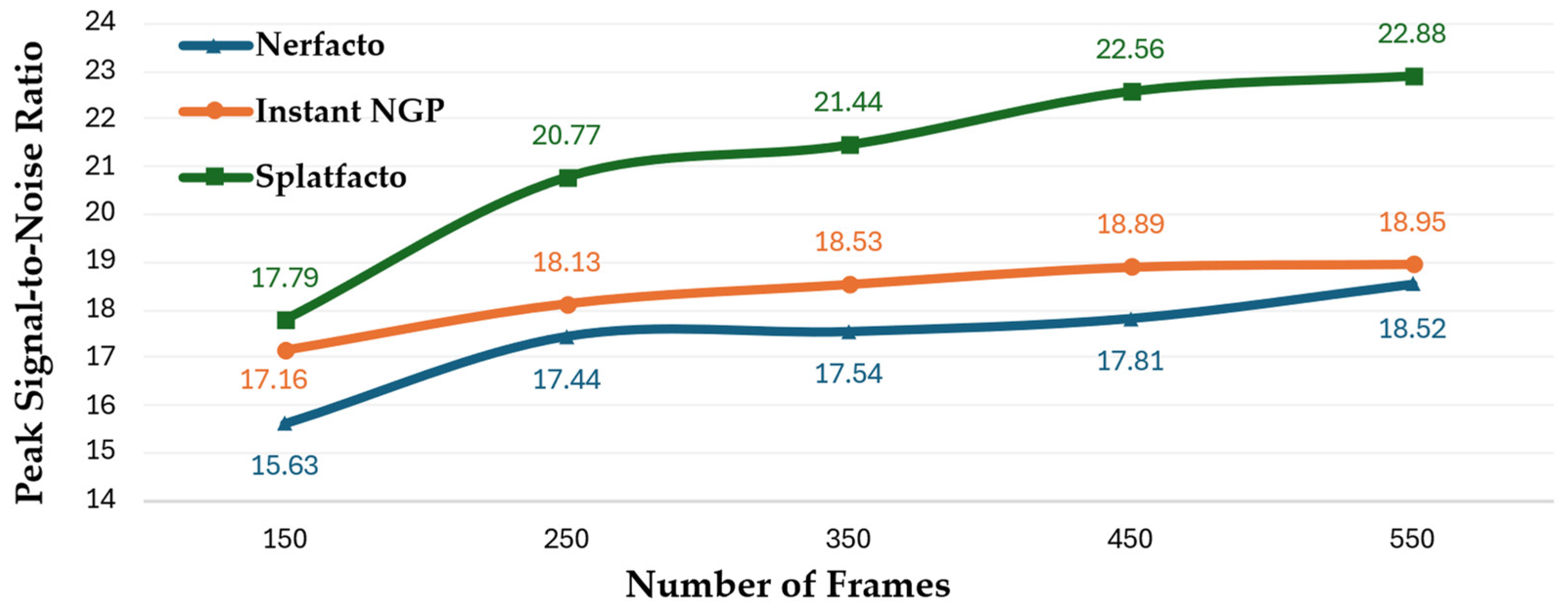 Figure 16, Splatfacto consistently achieves the highest PSNR values across all frame counts, ranging from 17.79 at 150 to 22.88 at 550 frames. Instant-NGP follows with values between 17.16 and 18.95, while Nerfacto performs the weakest, improving gradually from 15.63 to 18.52. This indicates that Splatfacto produces sharper and less noisy reconstructions, especially as scene coverage increases.