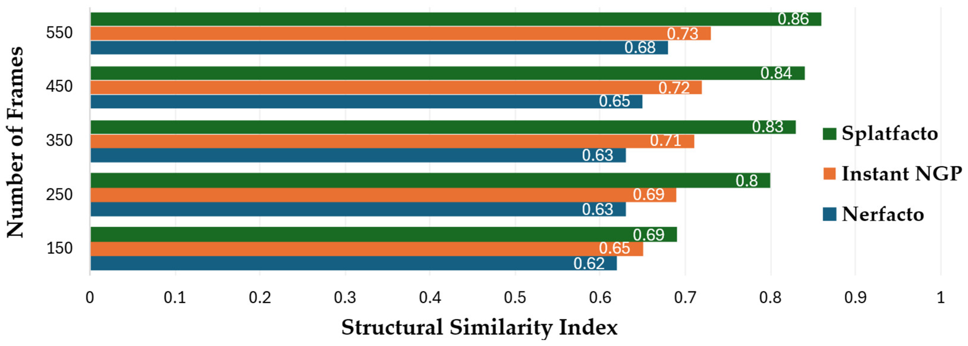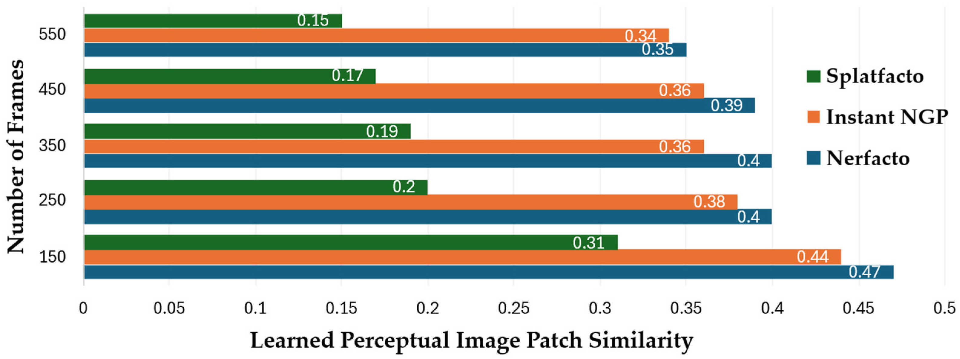Figure 18, shows that Splatfacto achieves the lowest perceptual error across all input sizes. As frames increase from 150 to 550, LPIPS values for Splatfacto consistently decrease from 0.31 to 0.15, reflecting a closer perceptual match between the reconstructed and reference images. Instant-NGP shows moderate performance, with values decreasing from 0.44 to 0.34. Nerfacto shows relatively higher LPIPS values, starting at 0.47 and decreasing to 0.35 as the number of frames increases, ultimately approaching the performance of Instant-NGP at higher input sizes. These results indicate that Splatfacto produces more visually faithful reconstructions, especially in scenarios with richer input data.